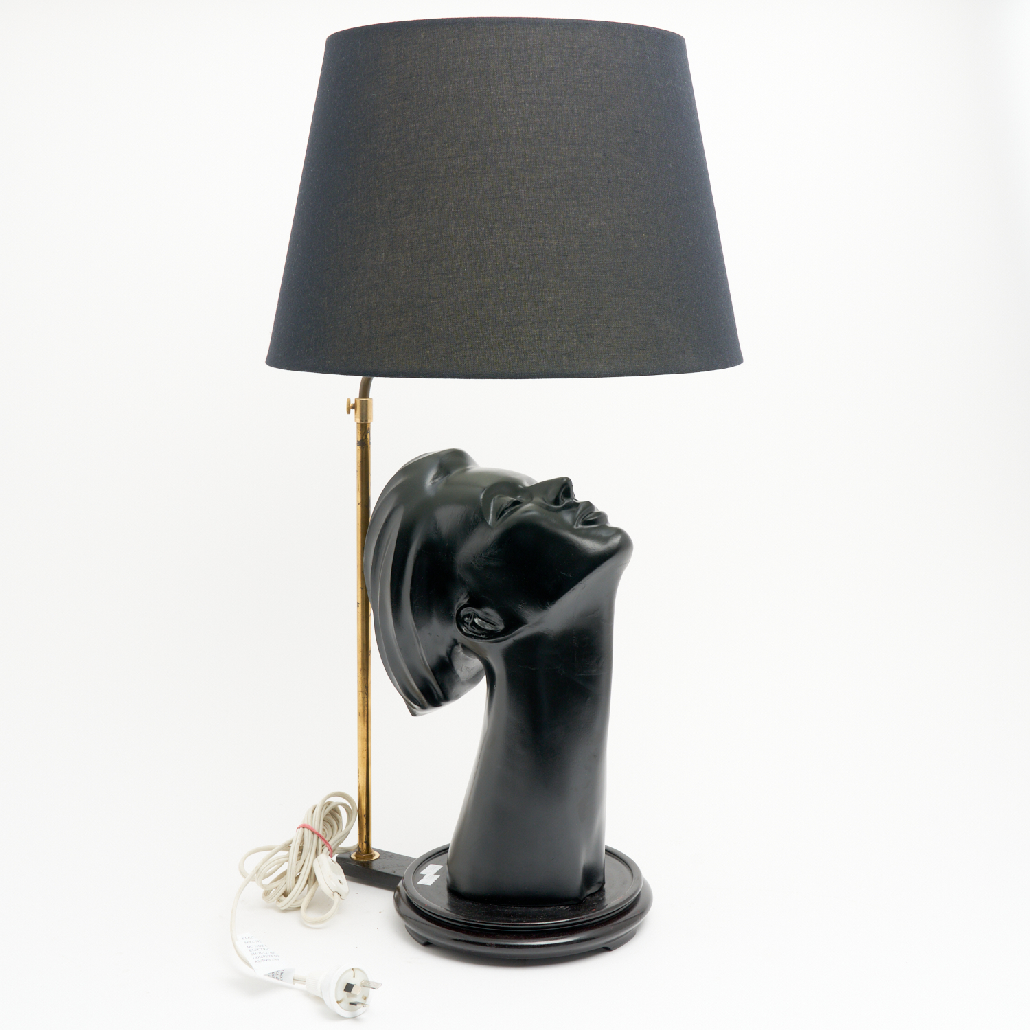 A STYLISED BLACK CERAMIC FIGURAL HEAD FORM LAMP ON WOODEN AND TELESCOPIC BRASS STAND H.73CM