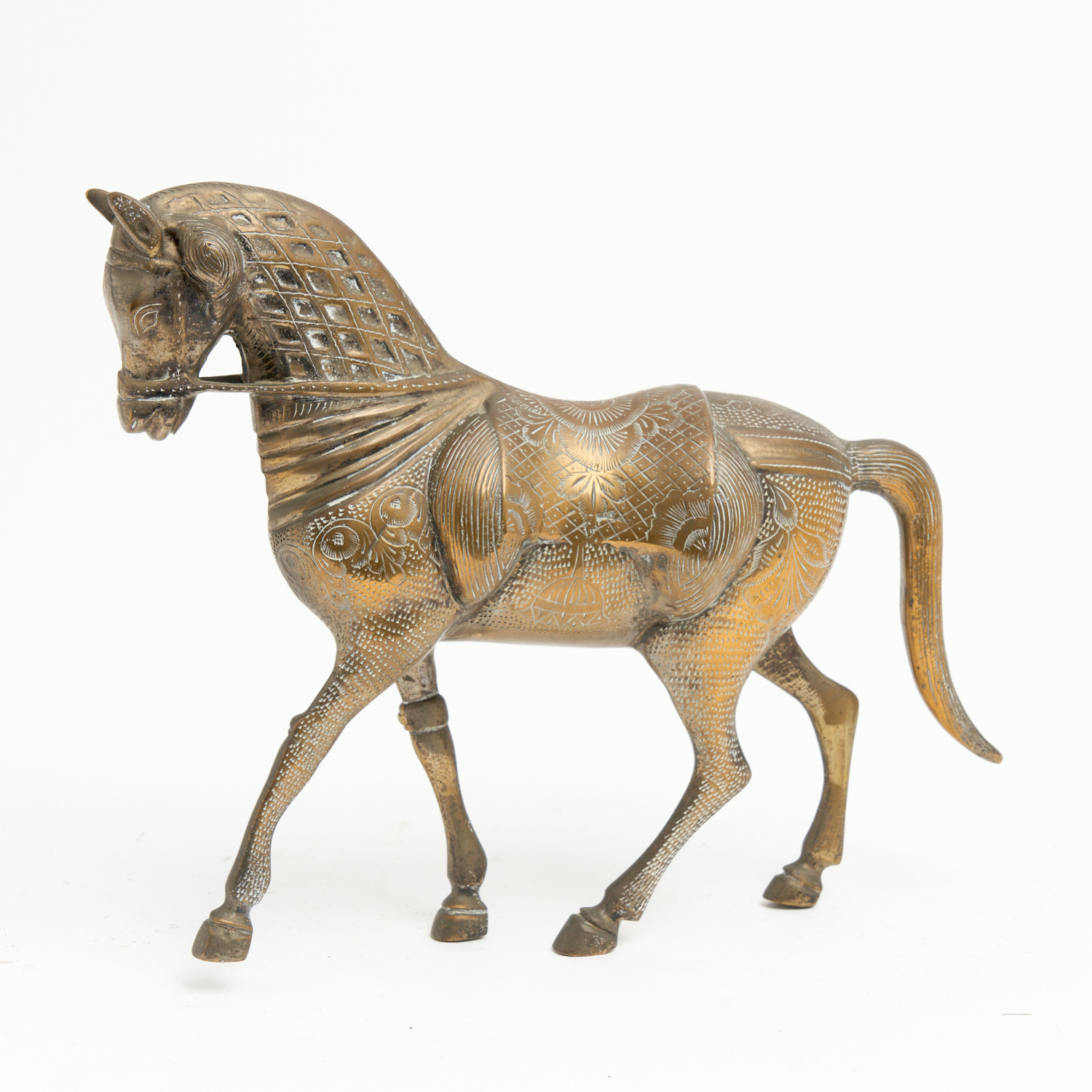 A HEAVILY ENGRAVED CAST HORSE FIGURE L.32CM