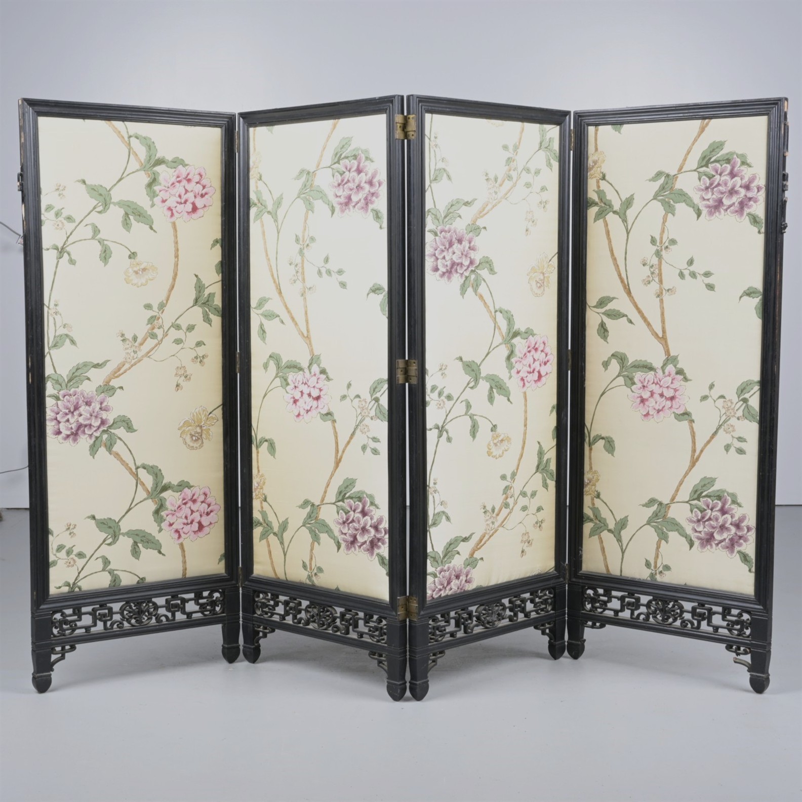 A CHINESE FOUR-LEAF SCREEN WITH SILK SCREEN PANELS WITHIN THE EBONISED WOOD FRAME (A/F) (160CM H X 63CM W)
