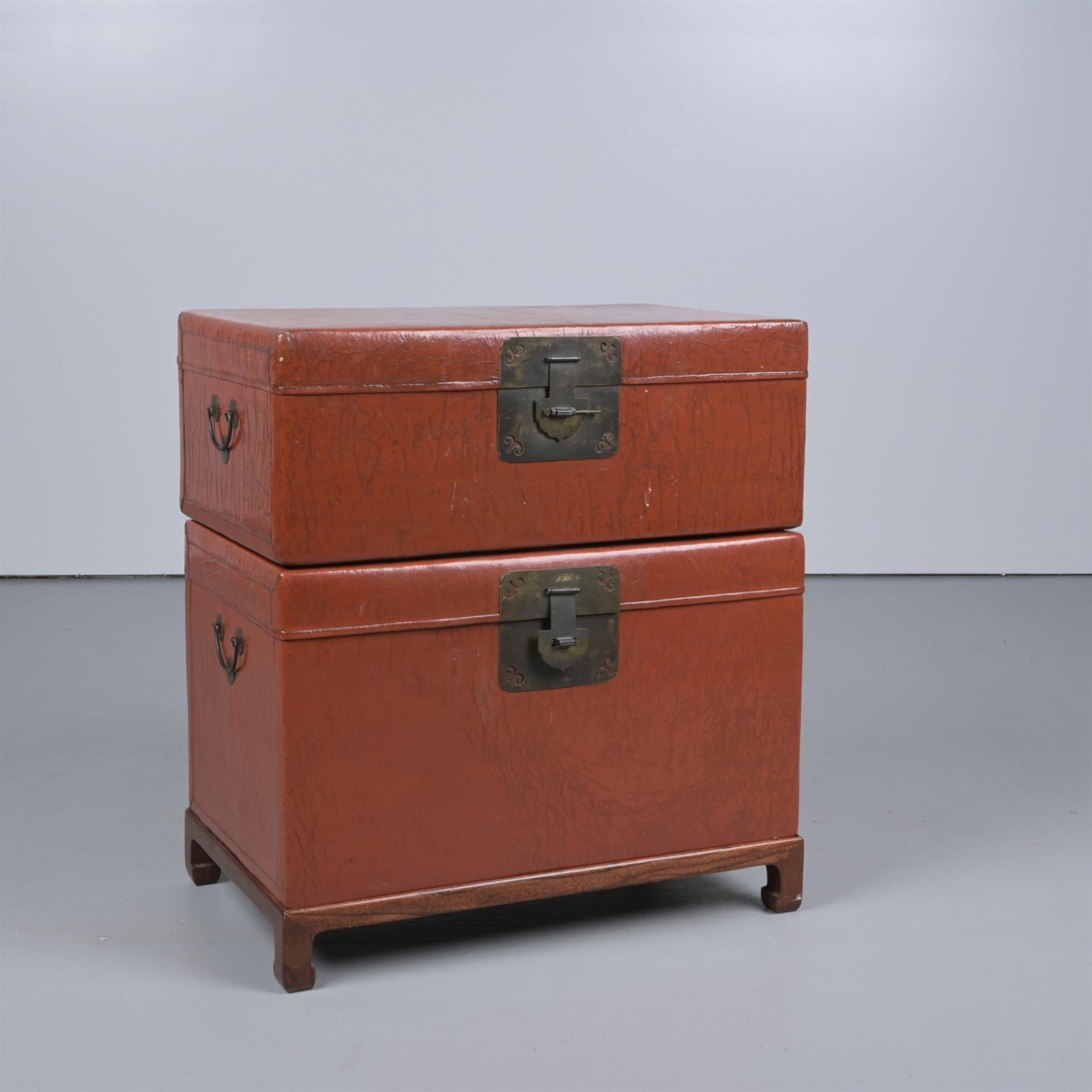 A CHINESE RED LACQUERED DOUBLE CHEST ON STAND (91CM H X 81CM W X 52CM D)