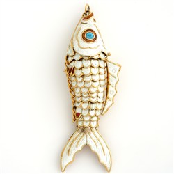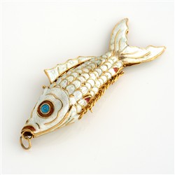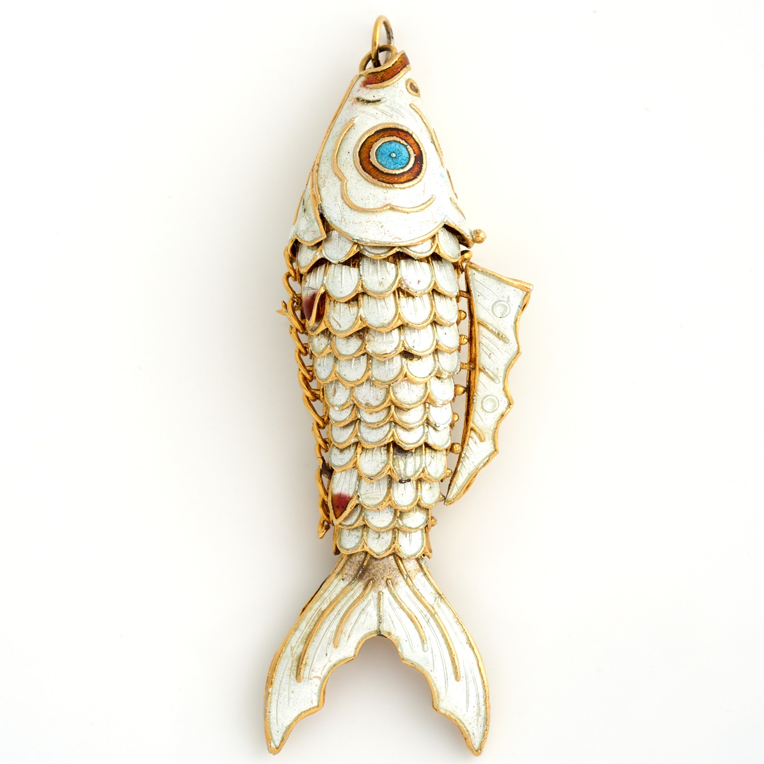 AN ENAMEL ARTICULATED FISH PENDANT IN GOLD PLATE, 100MM X 15MM