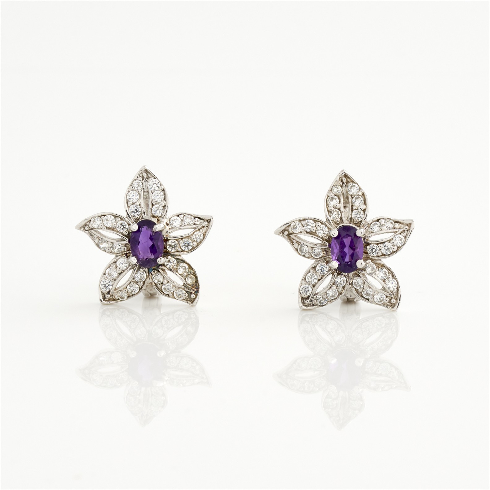 A PAIR OF AMETHYST AND CUBIC ZIRCONIA EARRINGS IN SILVER, TO POST AND HINGE CLIP FITTINGS, 20MM X 20MM