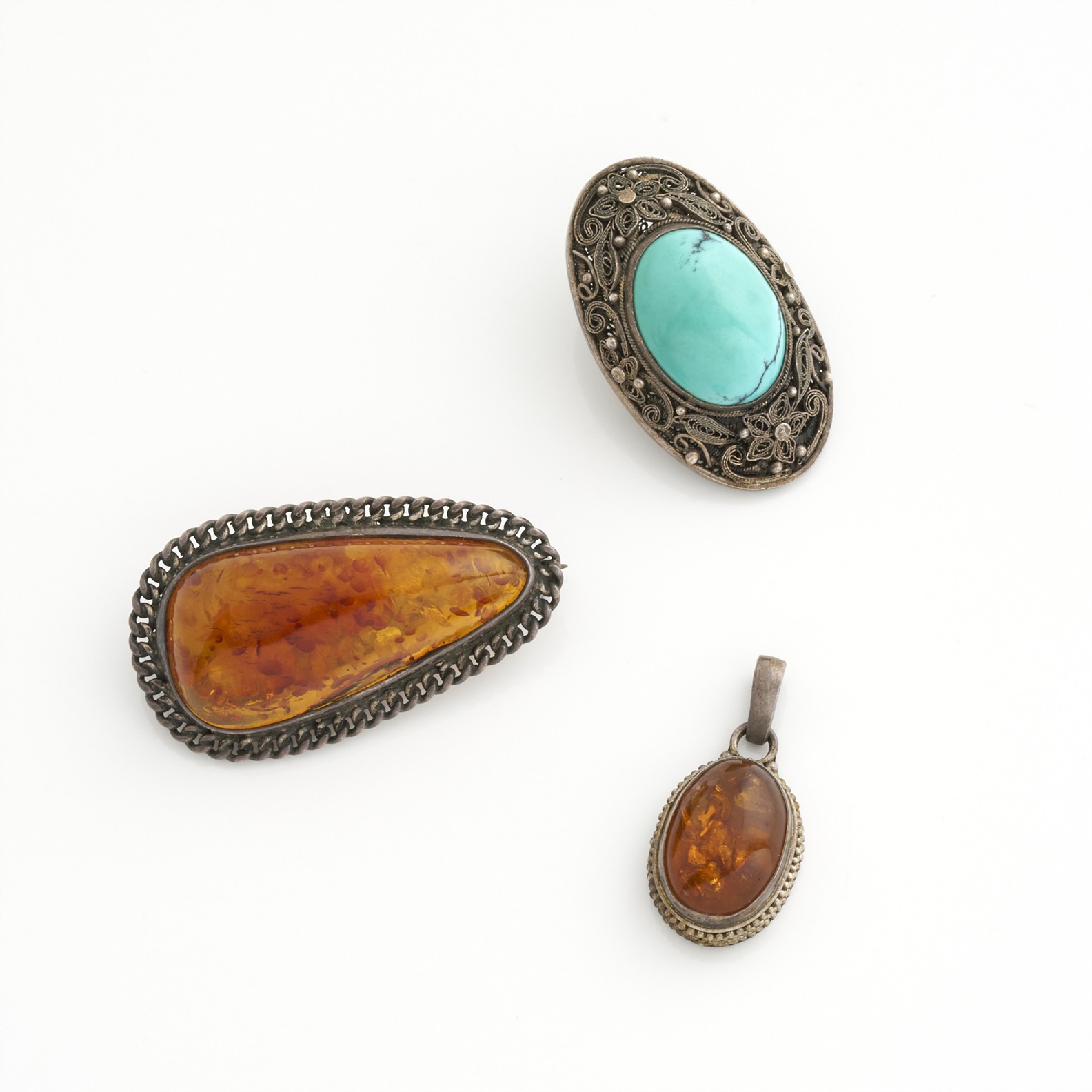 A COLLECTION OF AMBER AND TURQUOISE BROOCHES AND PENDANTS IN STERLING SILVER AND BASE METAL, THE LARGEST MEASURING 40MM X 25MM