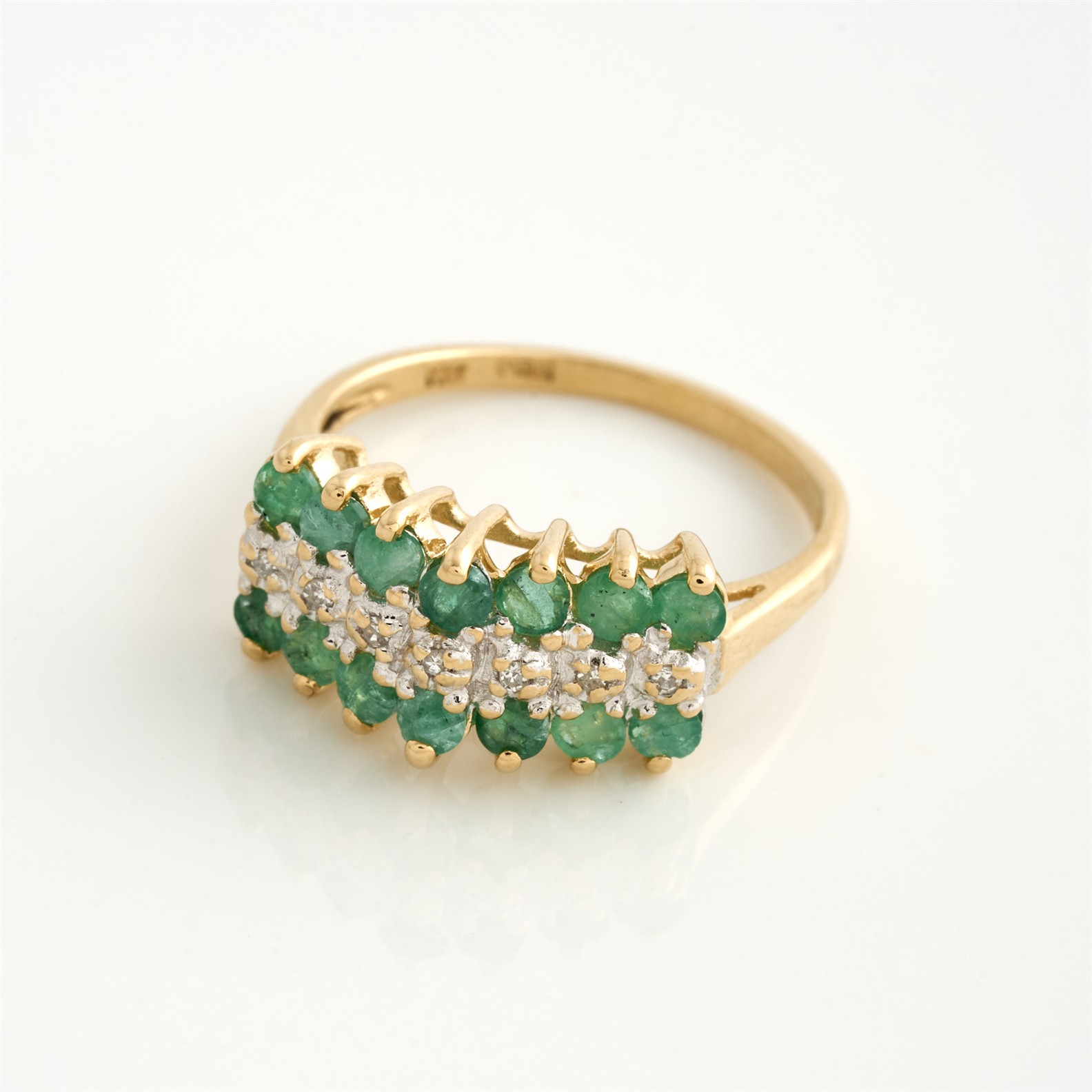 AN EMERALD AND DIAMOND RING IN 9CT GOLD, SIZE L, 2.14GMS