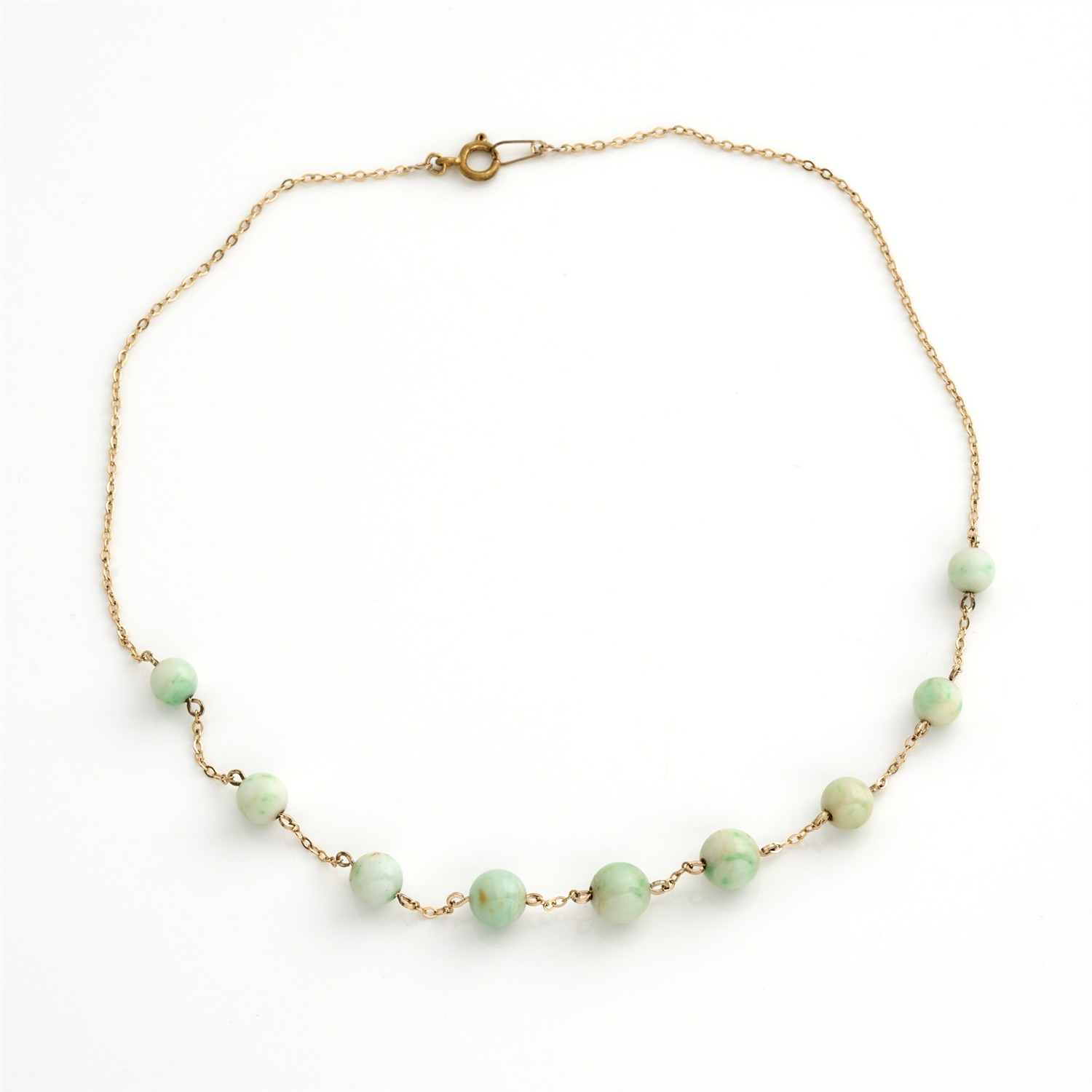 A GRADUATED DYED JADE BEAD NECKLACE IN GOLD PLATE, 460MM