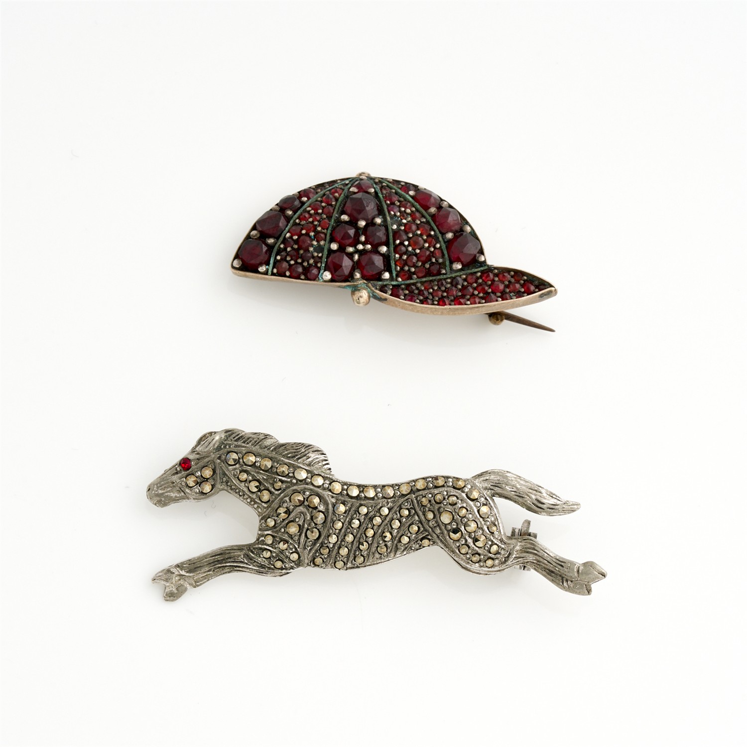 A GARNET BROOCH IN SILVER, 38MM X 16MM, TOGETHER WITH A MARCASITE HORSE BROOCH IN BASE METAL, 50MM X 17MM