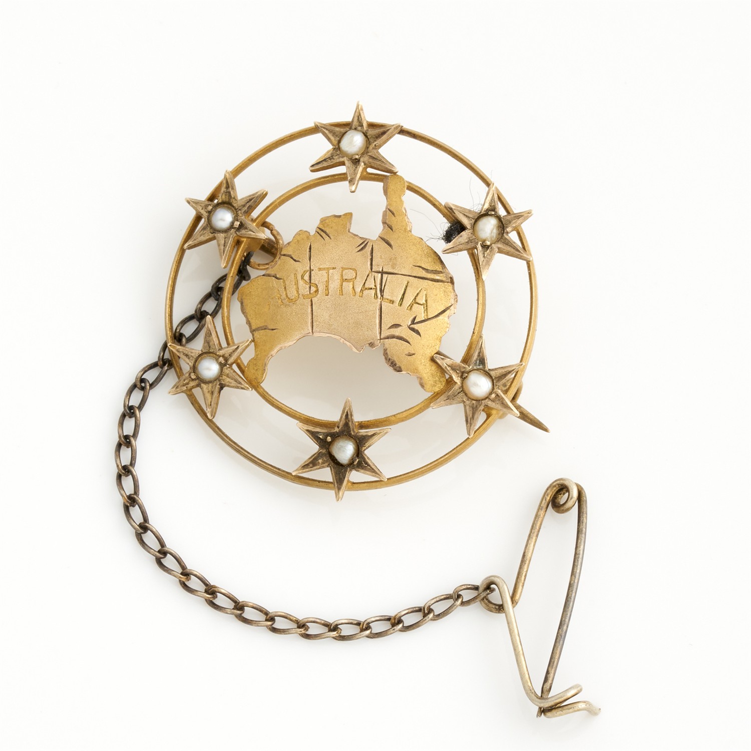 AN AUSTRALIANA SEED PEARL BROOCH IN 10CT GOLD, TO A SAFETY PIN AND CHAIN IN GOLD PLATE, 30MM, 2.9GMS
