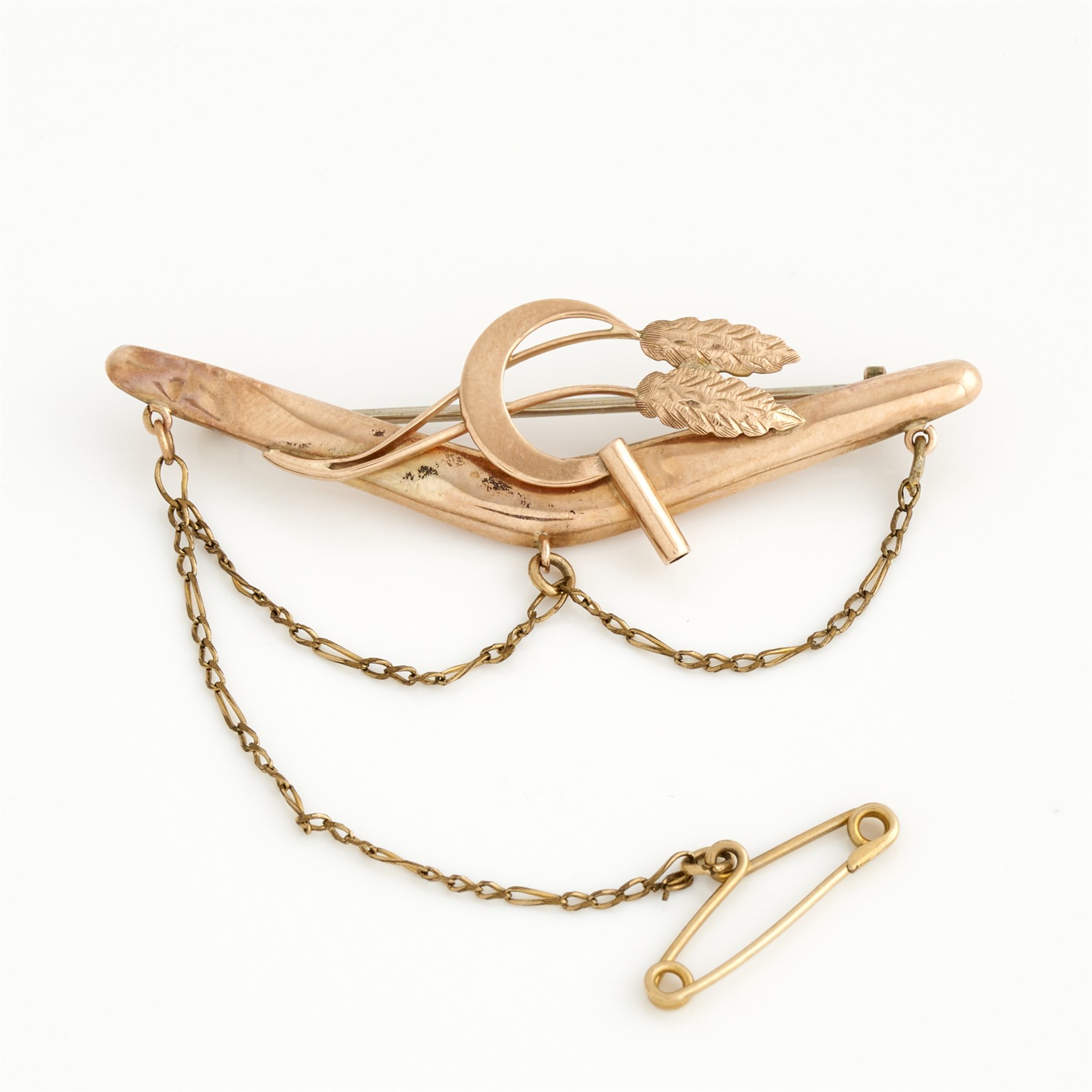 AN AUSTRALIANA WHEAT AND BOOMERANG MOTIF BROOCH IN 9CT GOLD, TO A SAFETY PIN AND CHAIN IN GOLD PLATE, 50MM, 2.6GMS