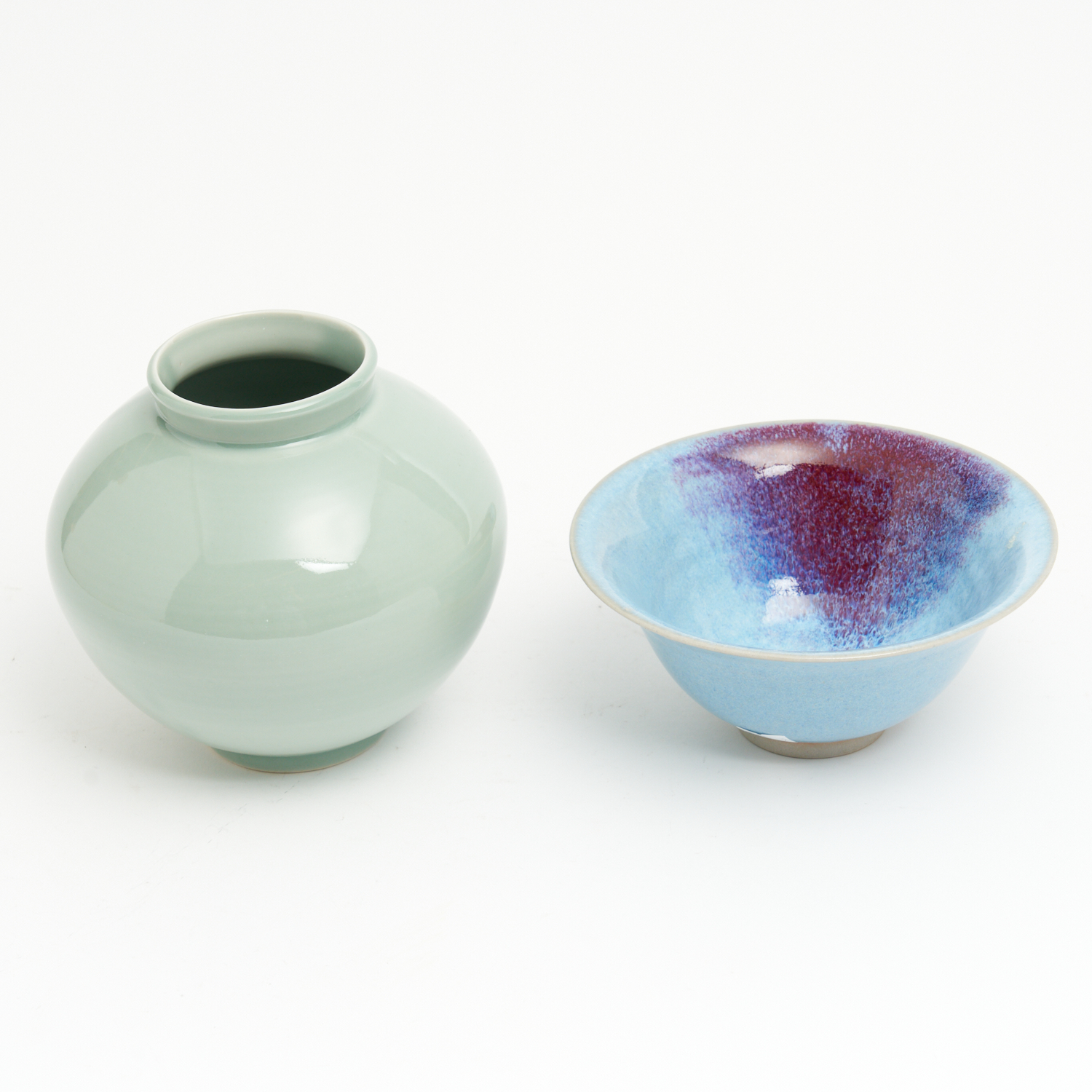 AN AUSTRALIAN POTTERY BOWL WITH CHUN GLAZE BY CHRISTOPHER SANDERS AND A CELADON GLAZED BLOSSOM JAR BY ALISTAIR WHYTE H.17CM (TALLEST)