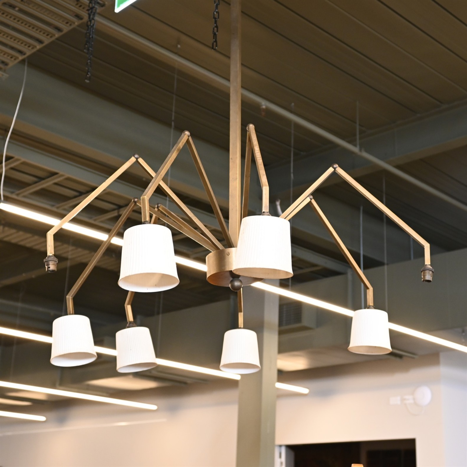 A BRASS 'SPIDER' LIGHT WITH CERAMIC SHADES (A/F)