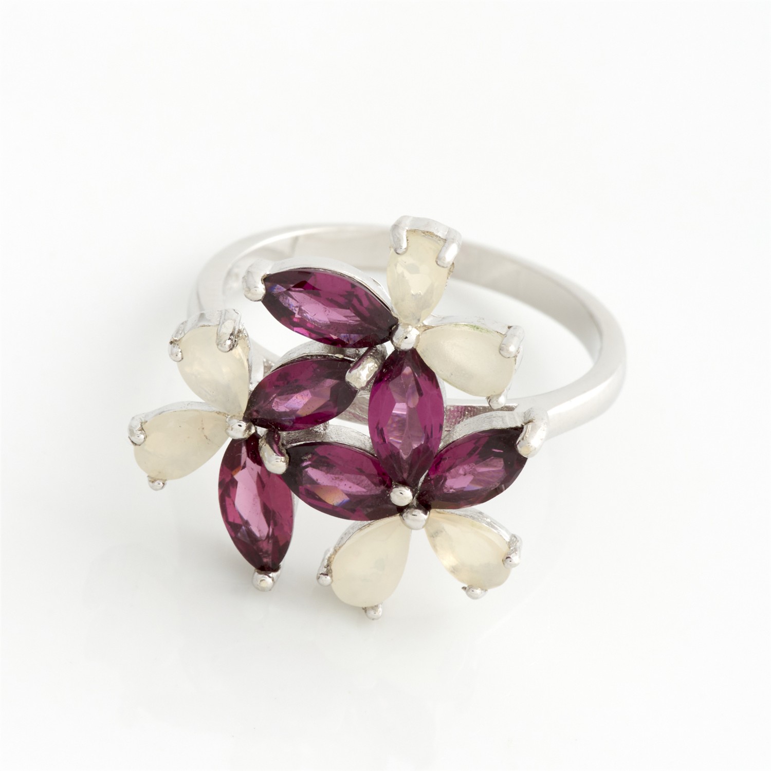 AN OPAL AND RHODOLITE GARNET RING IN STERLING SILVER, SIZE P