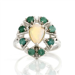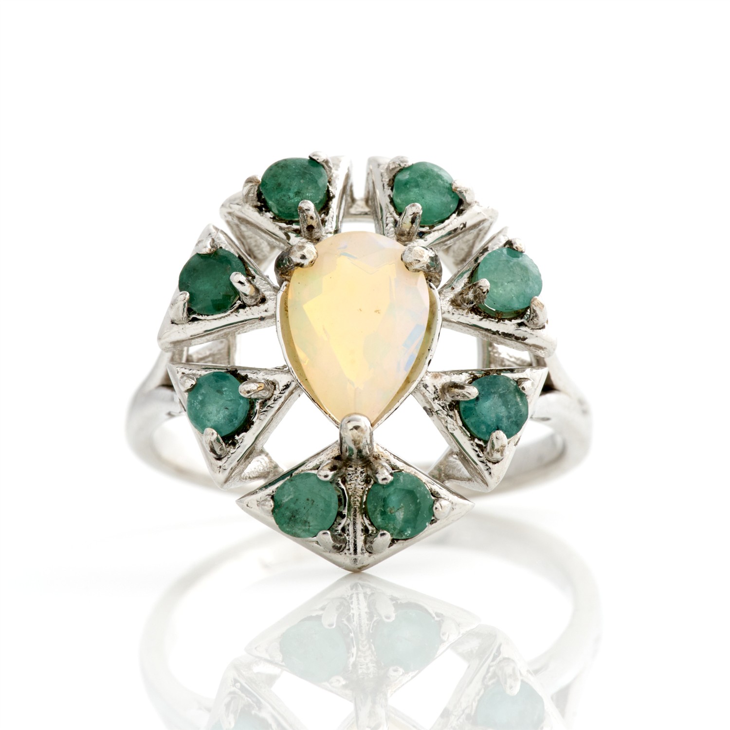 AN OPAL AND EMERALD RING IN STERLING SILVER, SIZE P