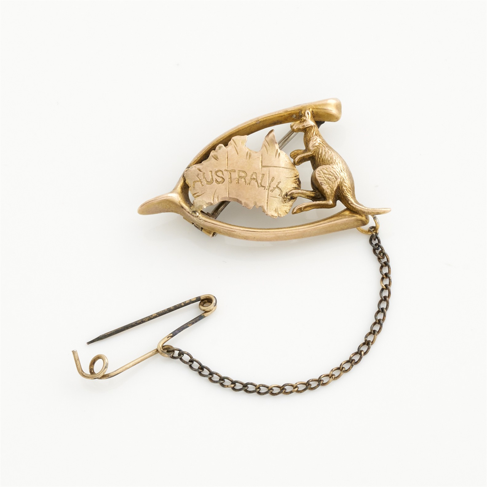AN AUSTRALIANA WISHBONE BROOCH IN 9CT GOLD, TO A SAFETY PIN AND CHAIN IN GOLD PLATE, 30MM X 20MM, 2.3GMS