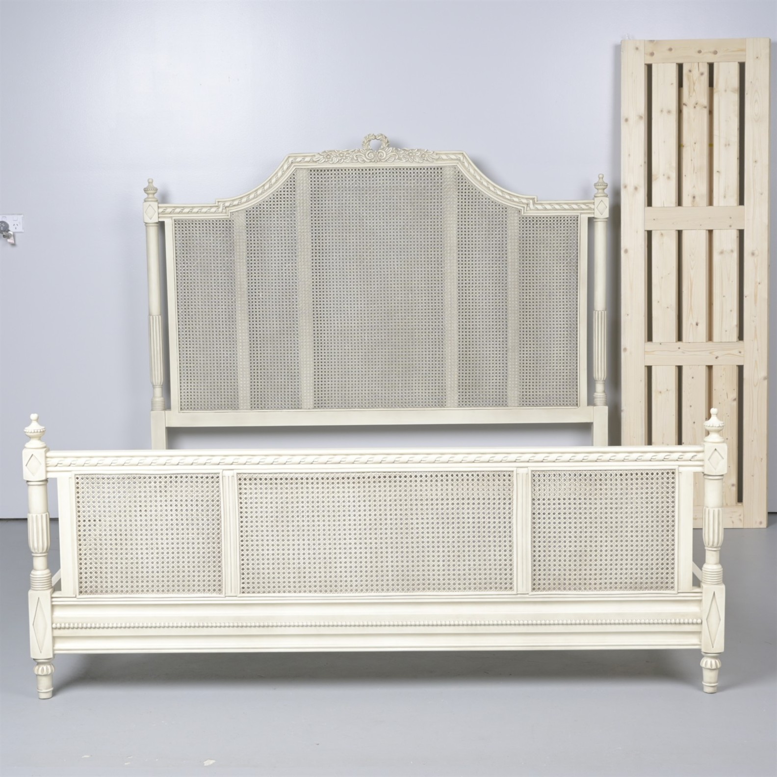 A NEW KING SIZE BED FRAME WITH CANED BEDHEAD. INTERNAL SLATS INCLUDED (THIS ITEM MUST BE REMOVED BY PROFESSIONAL CARRIERS OR CLIENTS. LEONARD JOEL STAFF CANNOT ASSIST WITH CARRYING OR DELIVERY OF THIS ITEM)