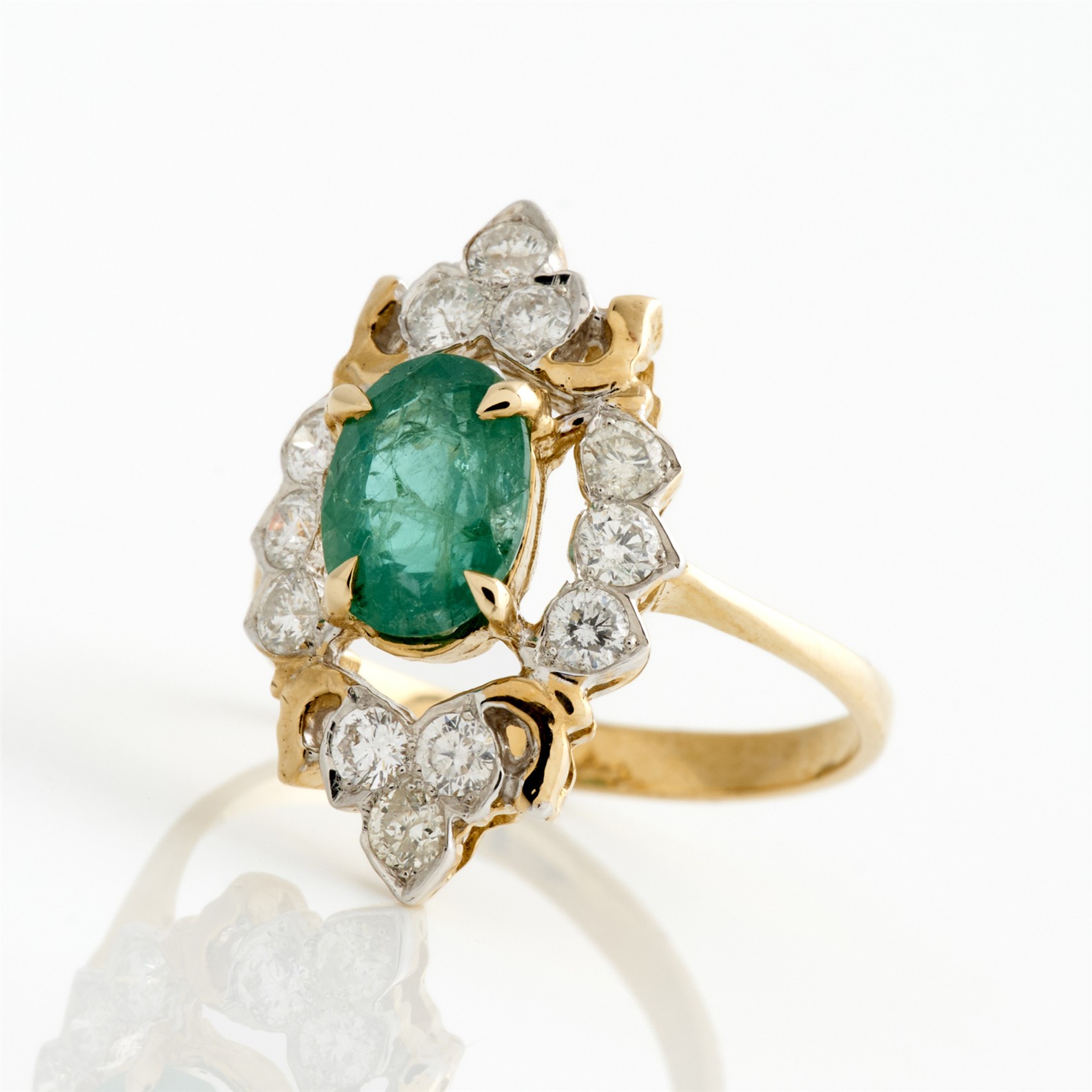 AN EMERALD AND DIAMOND RING IN 9CT GOLD, THE EMERALD WEIGHING APPROXIMATELY 1.17CTS, SIZE L, 2.8GMS
