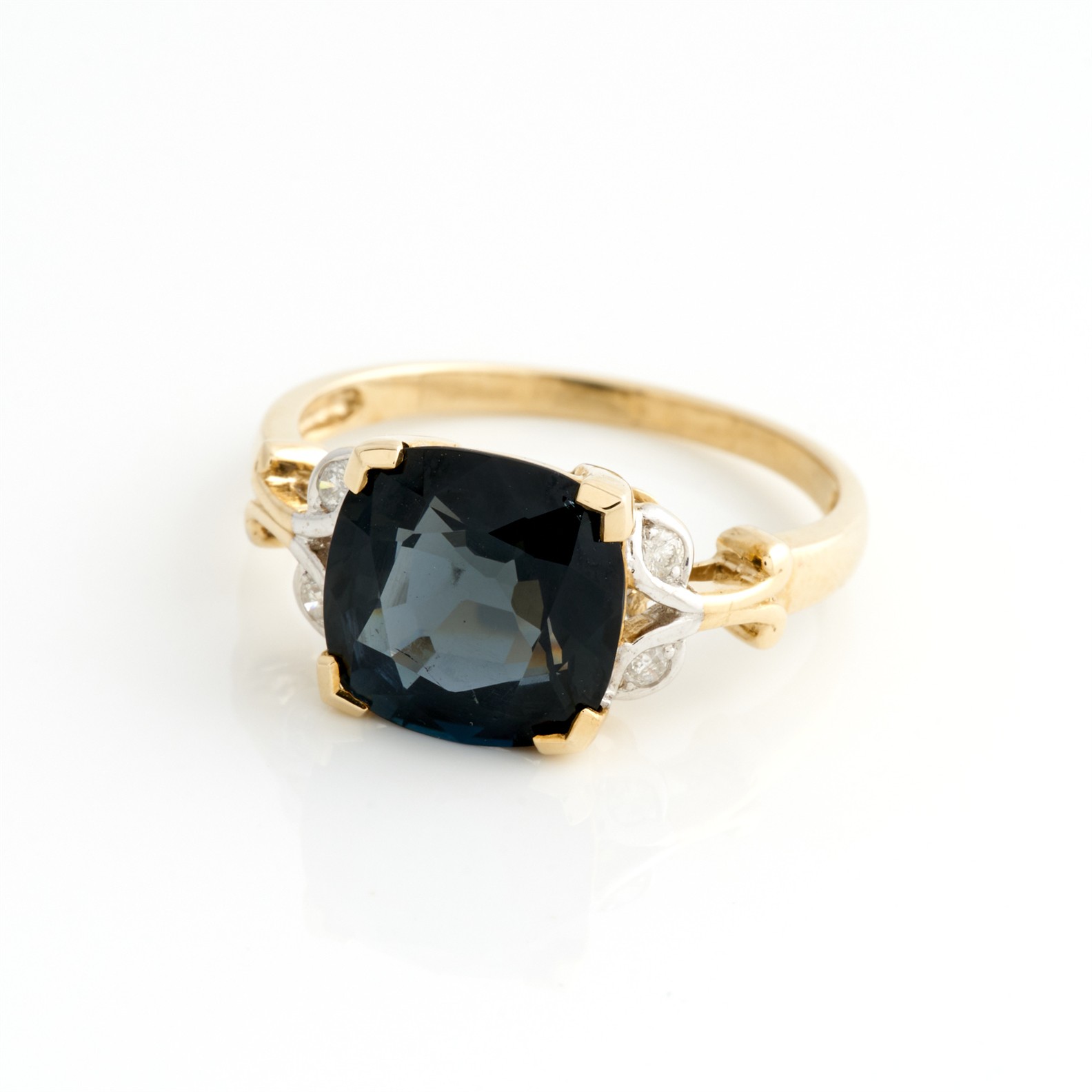 A LONDON BLUE TOPAZ AND DIAMOND RING IN 9CT GOLD, THE TOPAZ WEIGHING APPROXIMATELY 5.28CTS, SIZE R 1/2, 3.6GMS