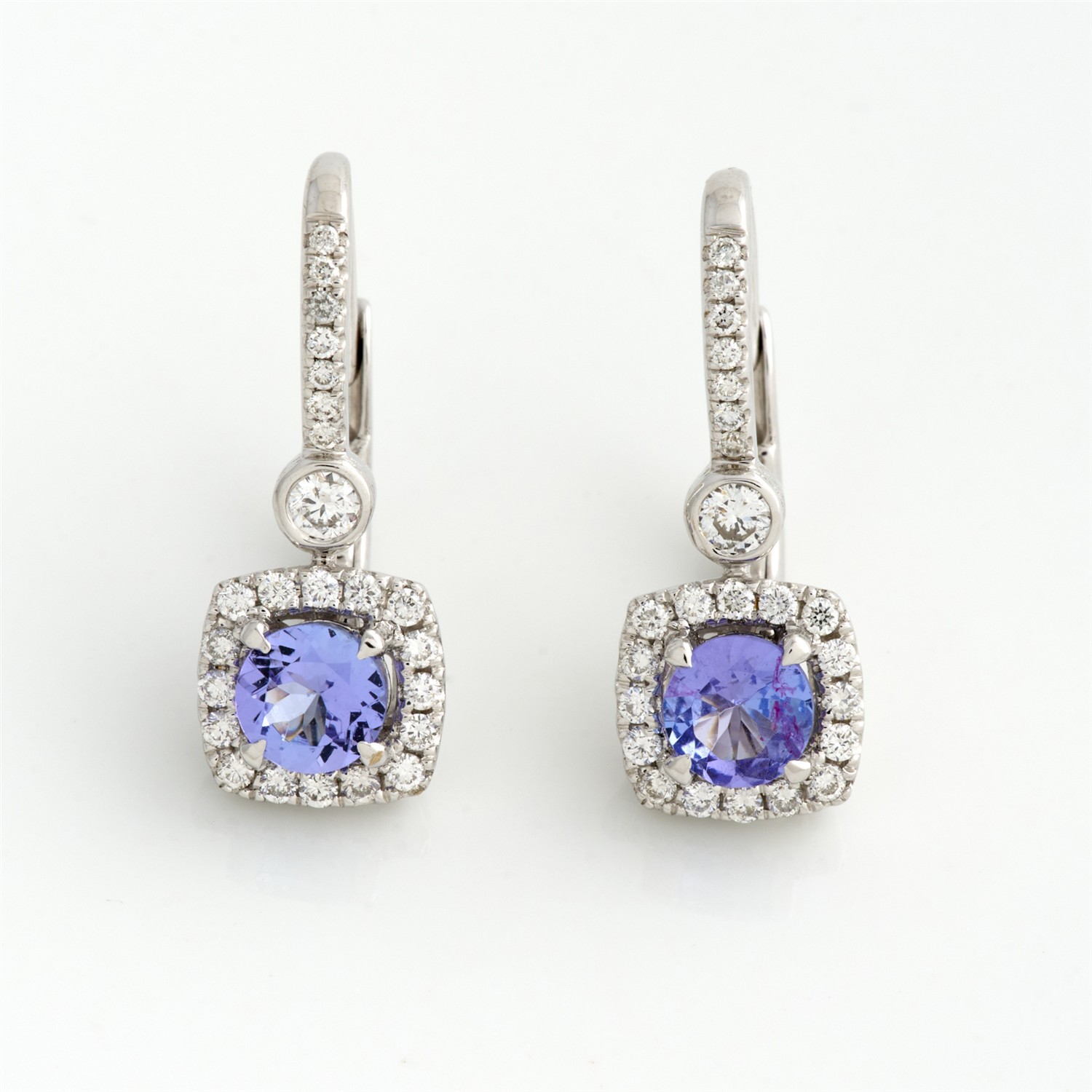 A PAIR OF TANZANITE AND DIAMOND EARRINGS IN 18CT WHITE GOLD, TO CONTINENTAL FITTINGS, THE TANZANITES WEIGHING 1.00CT, TOTAL DIAMOND WEIGHT 0.40CT, 4.4GMS