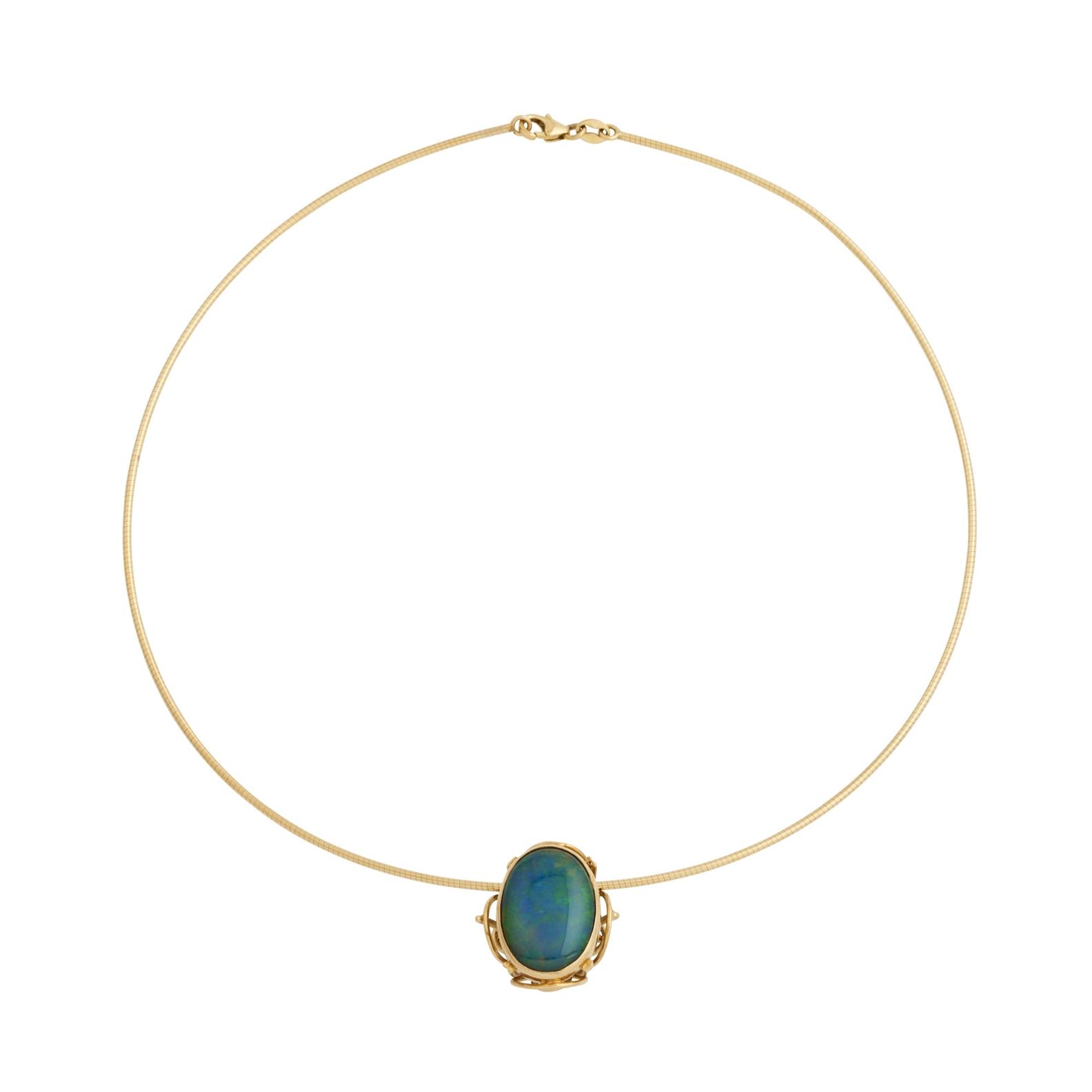 Centring a collet-set opal doublet, suspended on a rounded 9ct gold omega chain, mounted in 18ct gold, pendant length 20mm, inner circumference 400mm.