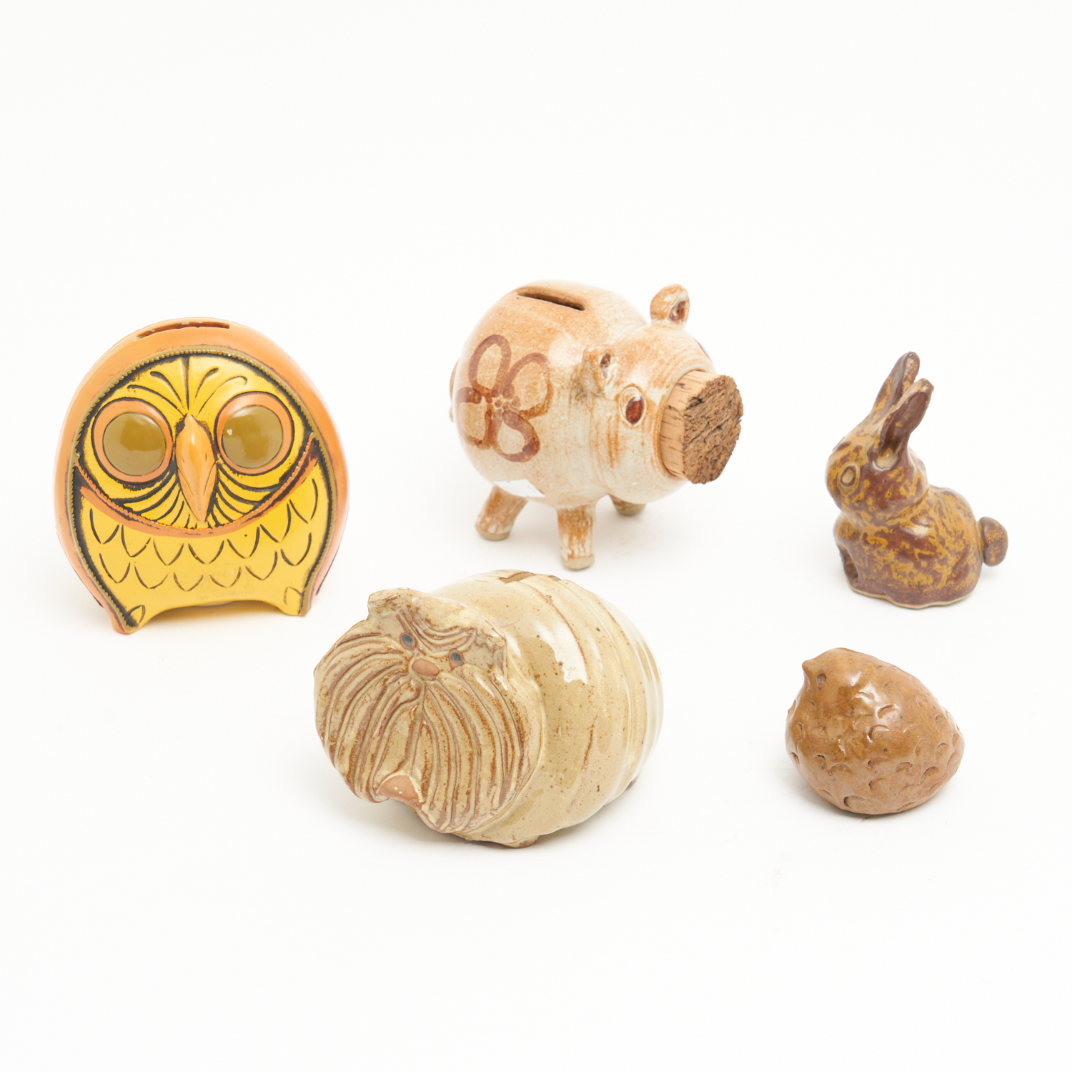 A GROUP OF FOUR POTTERY ANIMALS PLUS ONE OTHER H.13CM (TALLEST)