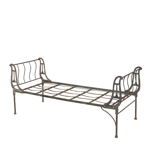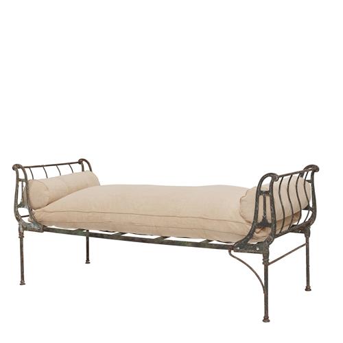19th century, having openwork scrolled ends, in distressed finish, with beige coarse linen upholstered bolsters and cushion.