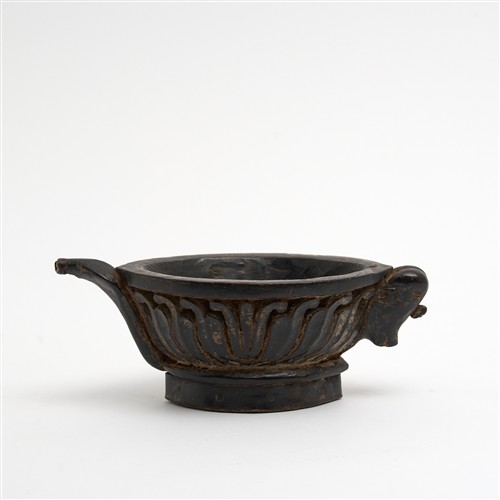 A 19TH CENTURY CARVED FIGURAL ENDED WOODEN OPIUM CUP L.20CM