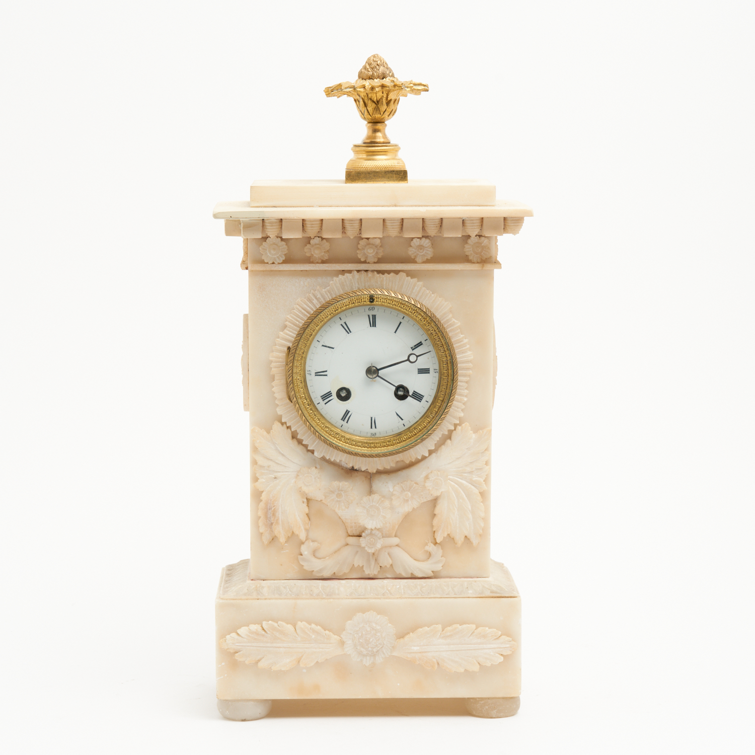 A C.1860 FRENCH RESTORATION ALABASTER AND BRONZE MANTLE CLOCK, WITH KEY AND PENDULUM (A/F) H.43CM