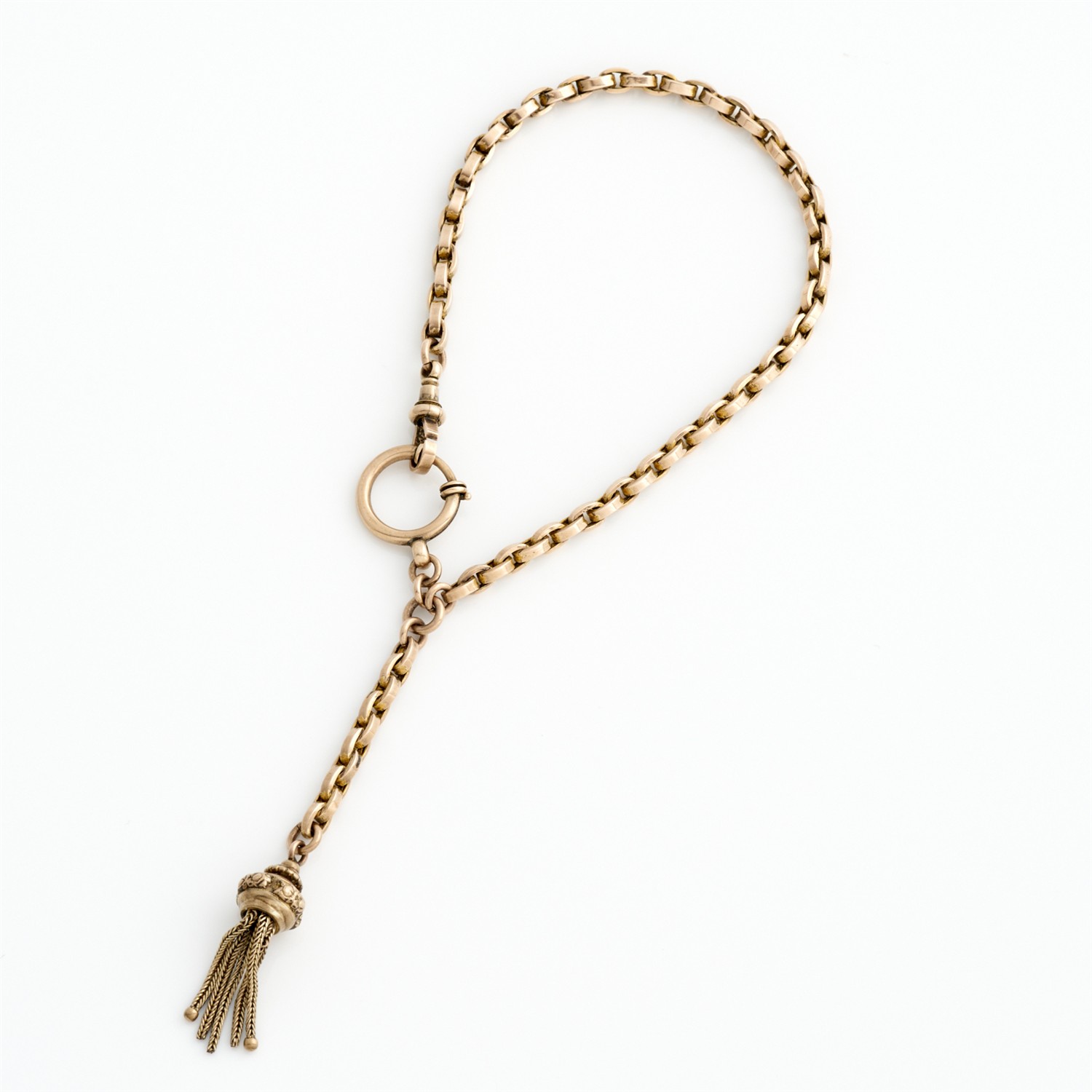 A FOB CHAIN IN 8CT GOLD, TO A TASSLE, 280MM, 15.6GMS