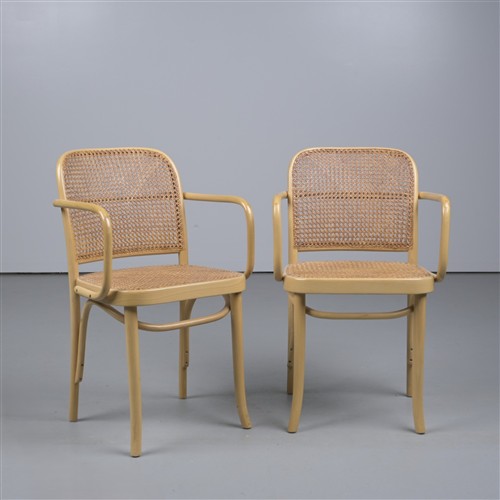 A PAIR OF THONET 'No. 811' ('HOFFMANN') MODEL BEECH BENTWOOD AND CANED ELBOW CHAIRS (83CM H X 49CM W X 50CM D)