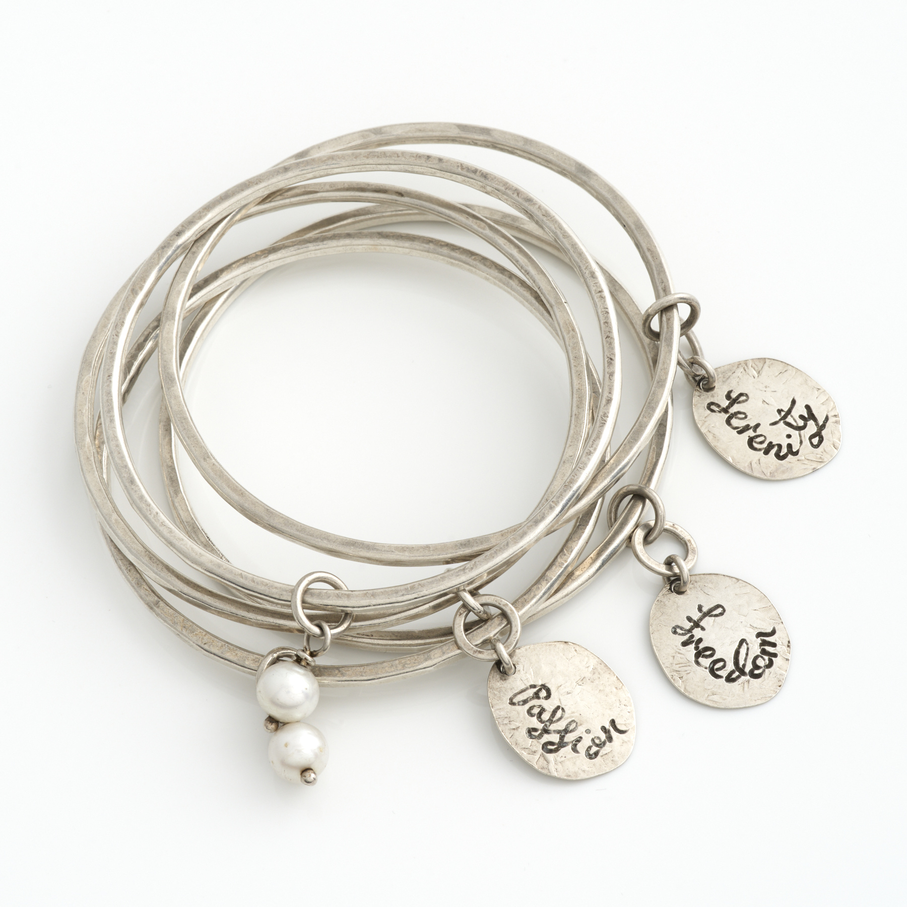 A COLLECTION OF FIVE BANGLES IN STERLING SILVER, INNER DIAMETER 65MM