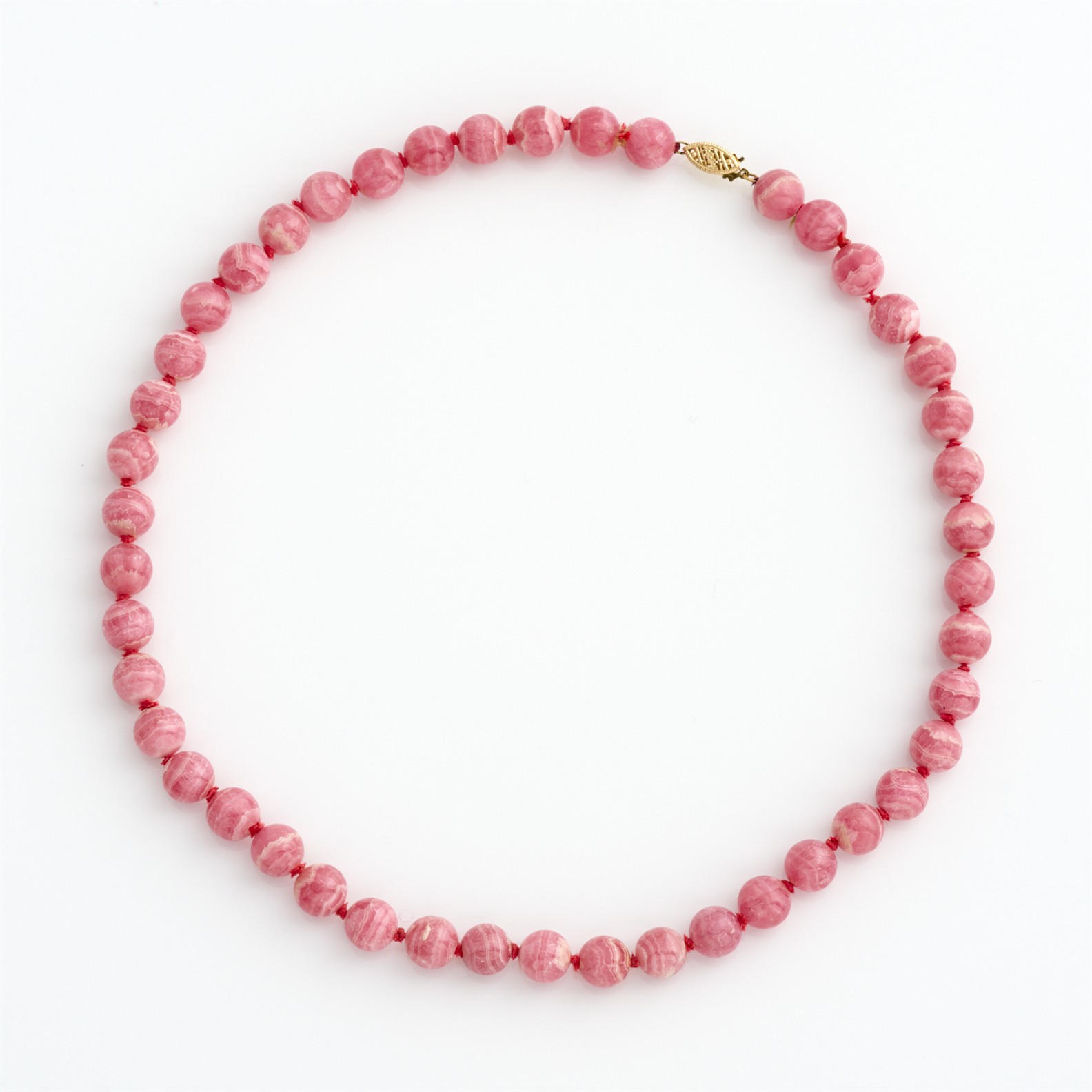 A STRAND OF RHODOCHROSITE BEADS, TO A CLASP IN 14CT GOLD, 440MM