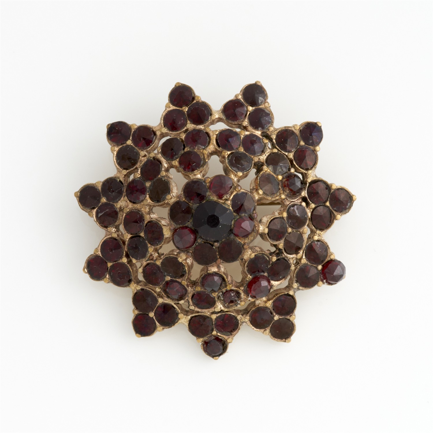 A VINTAGE GARNET BROOCH IN GOLD PLATE, 35MM, 10.28GMS