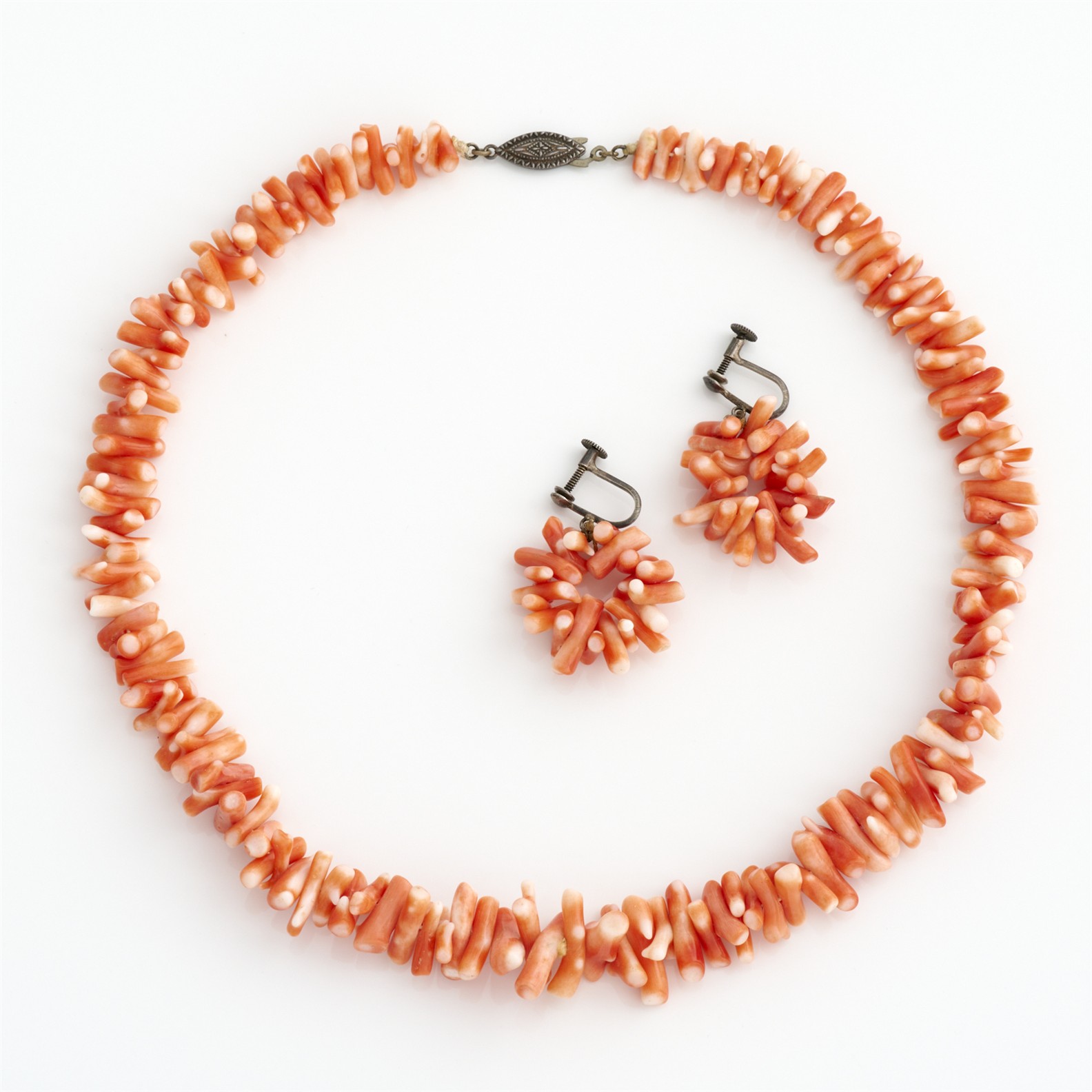 A STRAND OF DYED CORAL BEADS, 400MM, TO A CLASP IN STERLING SILVER, TOGETHER WITH A PAIR OF DYED CORAL BEAD EARRINGS IN STERLING SILVER, TO SCREWBACK FITTINGS, 30MM