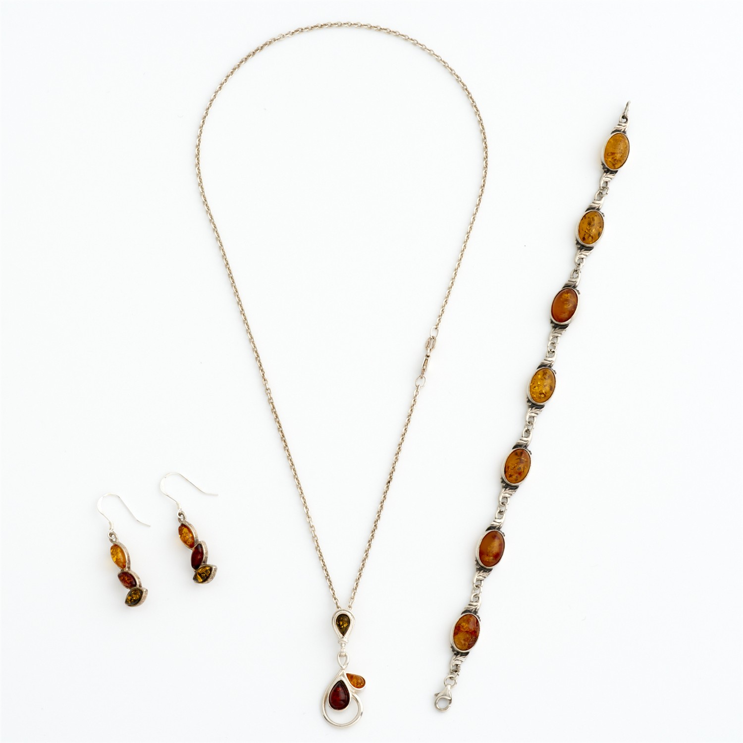 A COLLECTION OF AMBER JEWELLERY IN SILVER, COMPRISING A NECKLACE, 460MM, A BRACELET, 200MM, AND EARRINGS TO SHEPHERD HOOK FITTINGS, 40MM