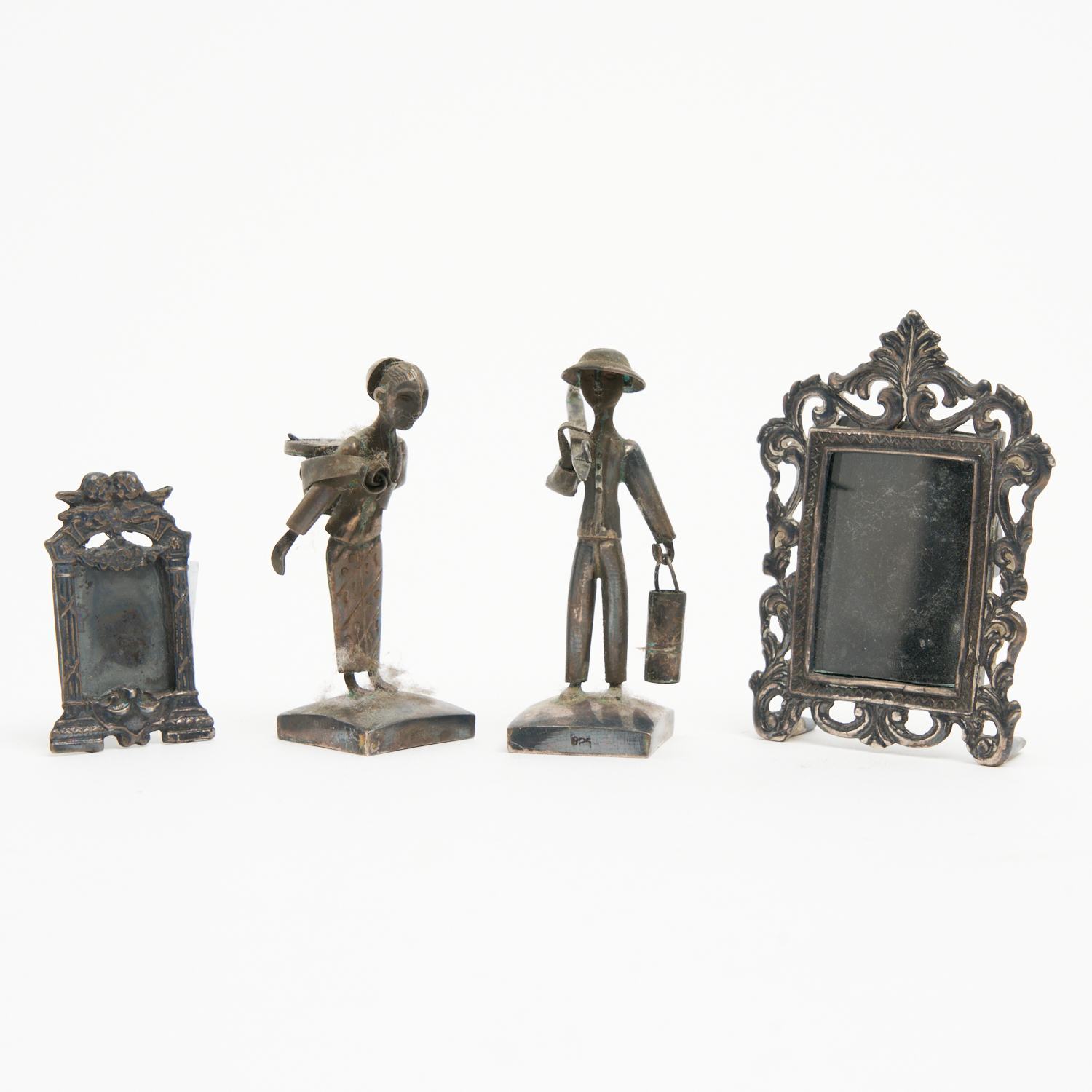 FOUR 925 SILVER MINIATURES INCLUDING TWO MINIATURE FRAMES, AND TWO FIGURES H.6.5CM (TALLEST)