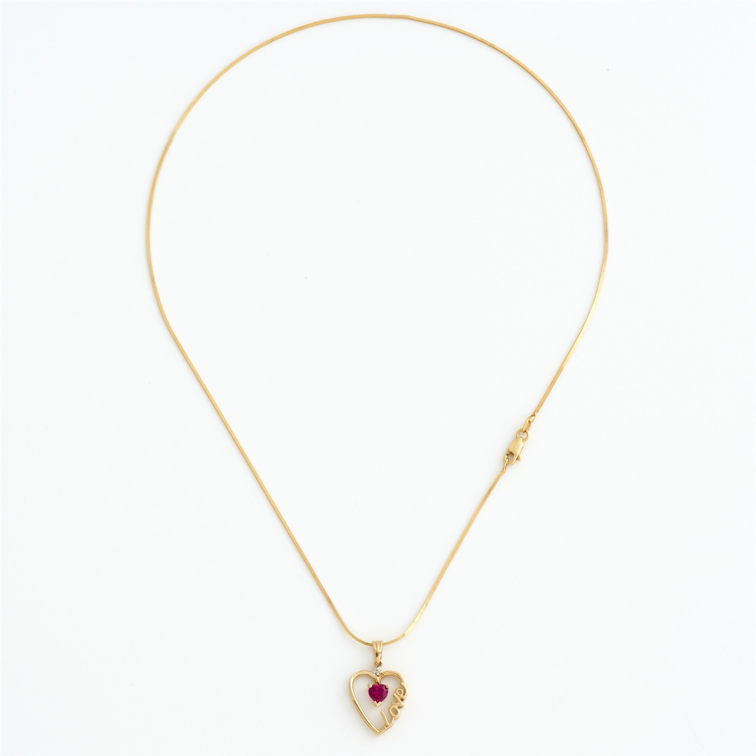 A SYNTHETIC RUBY 'LOVE' PENDANT NECKLACE IN 9CT GOLD, 440MM, TOTAL WEIGHT 4.12GMS