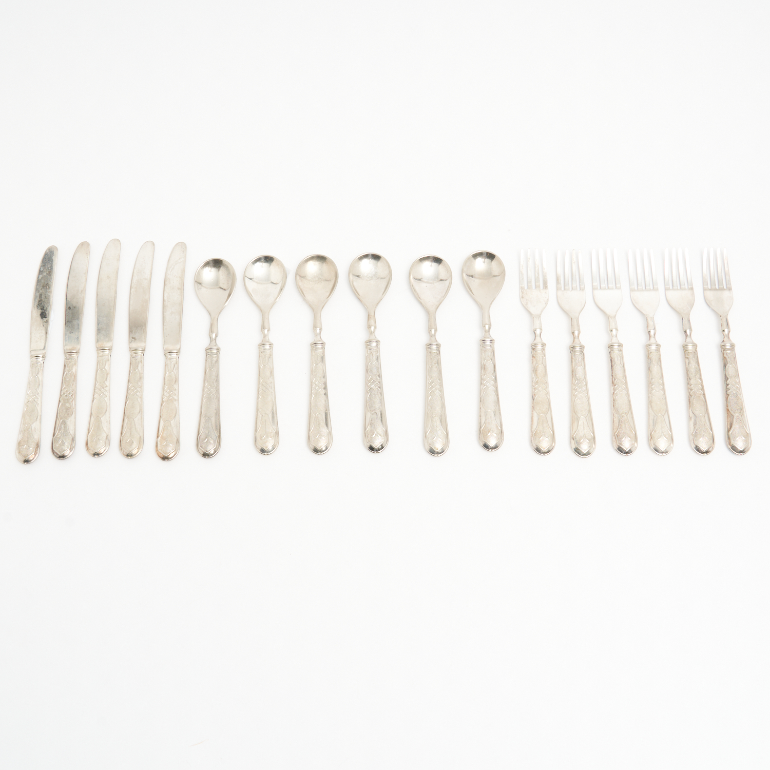 AN 800 SILVER HANDLED DESSERT SERVICE FOR SIX (MISSING ONE KNIFE) L.18.5CM
