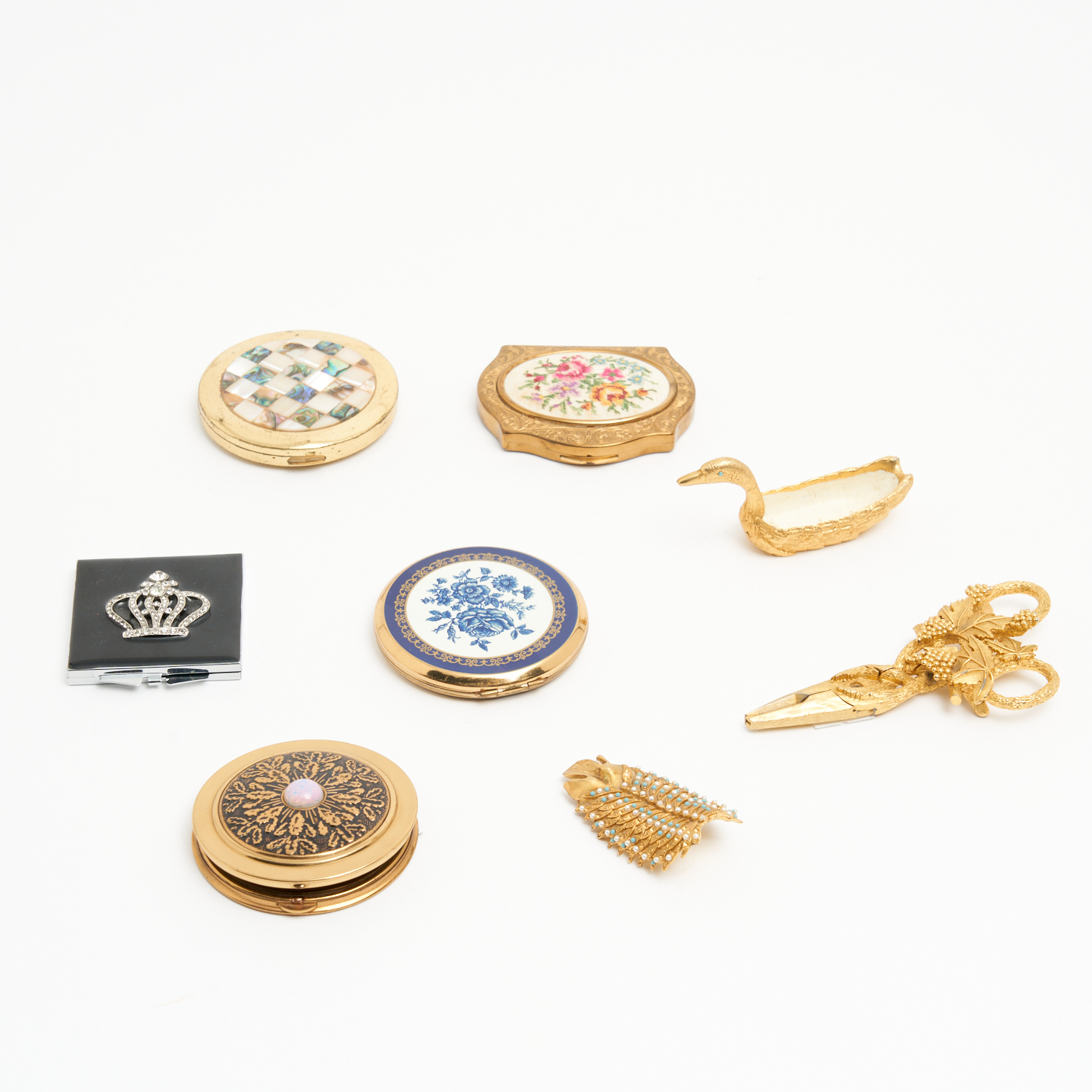 FIVE DECORATIVE COMPACTS TOGETHER WITH TWO PIECES BY MIRELLA INCLUDING A GILDED PAIR OF GRAPE SCISSORS, AND A GILDED ENAMEL DUCK-FORM TRINKET BOX L.12.5CM