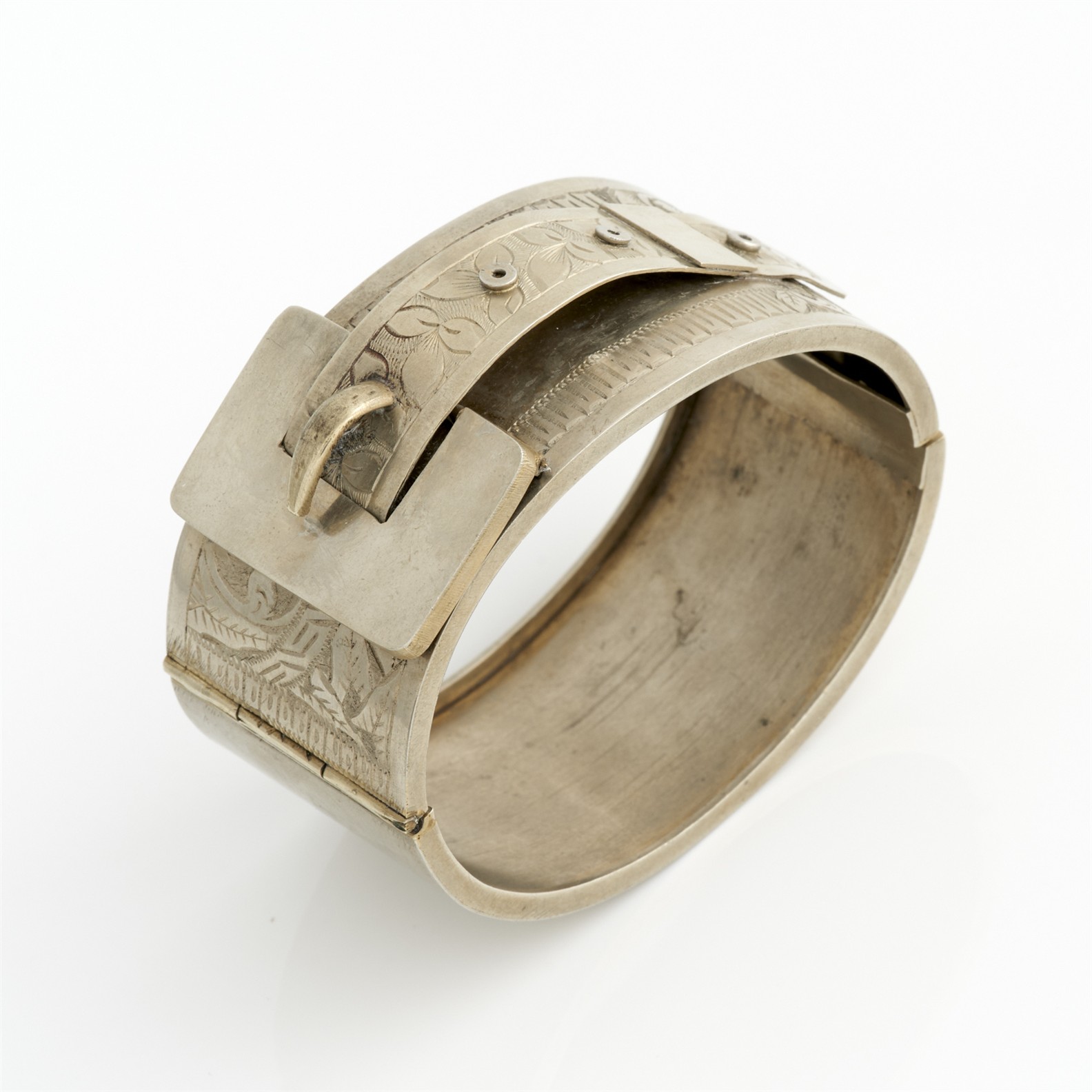 A HINGED BUCKLE BANGLE IN SILVER, INNER DIAMETER 60MM