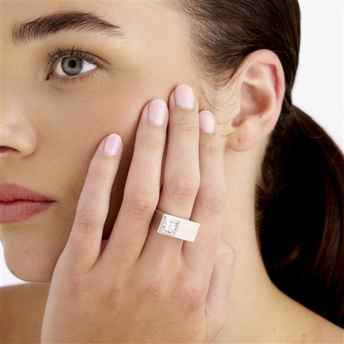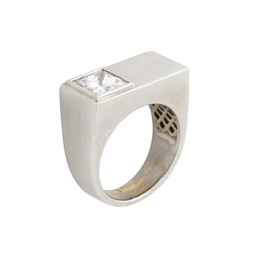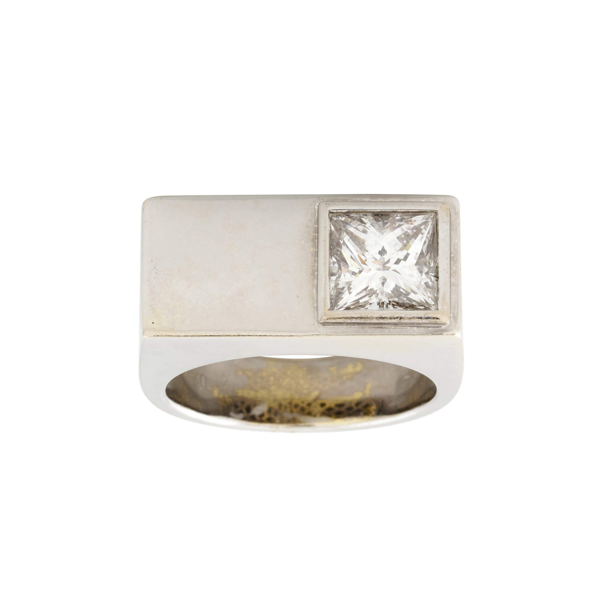 Centring a princess-cut diamond weighing approximately 2.01 carats, off-set in a modernist design to a tapered band,