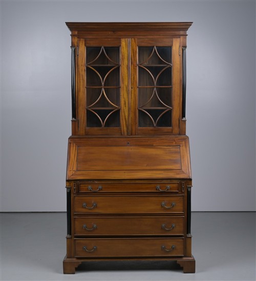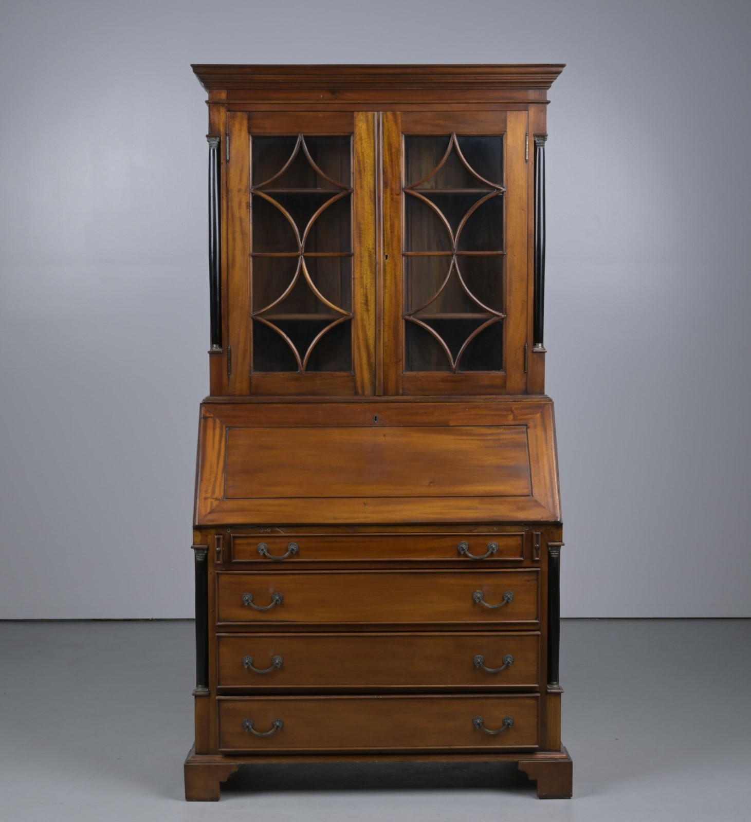 A MAHOGANY BUREAU BOOKCASE IN ANTIQUE MANNER (202CM H X 106CM W X 52CM D) (THIS ITEM MUST BE REMOVED BY PROFESSIONAL CARRIERS OR CLIENTS. LEONARD JOEL STAFF CANNOT ASSIST WITH CARRYING OR DELIVERY OF THIS ITEM)