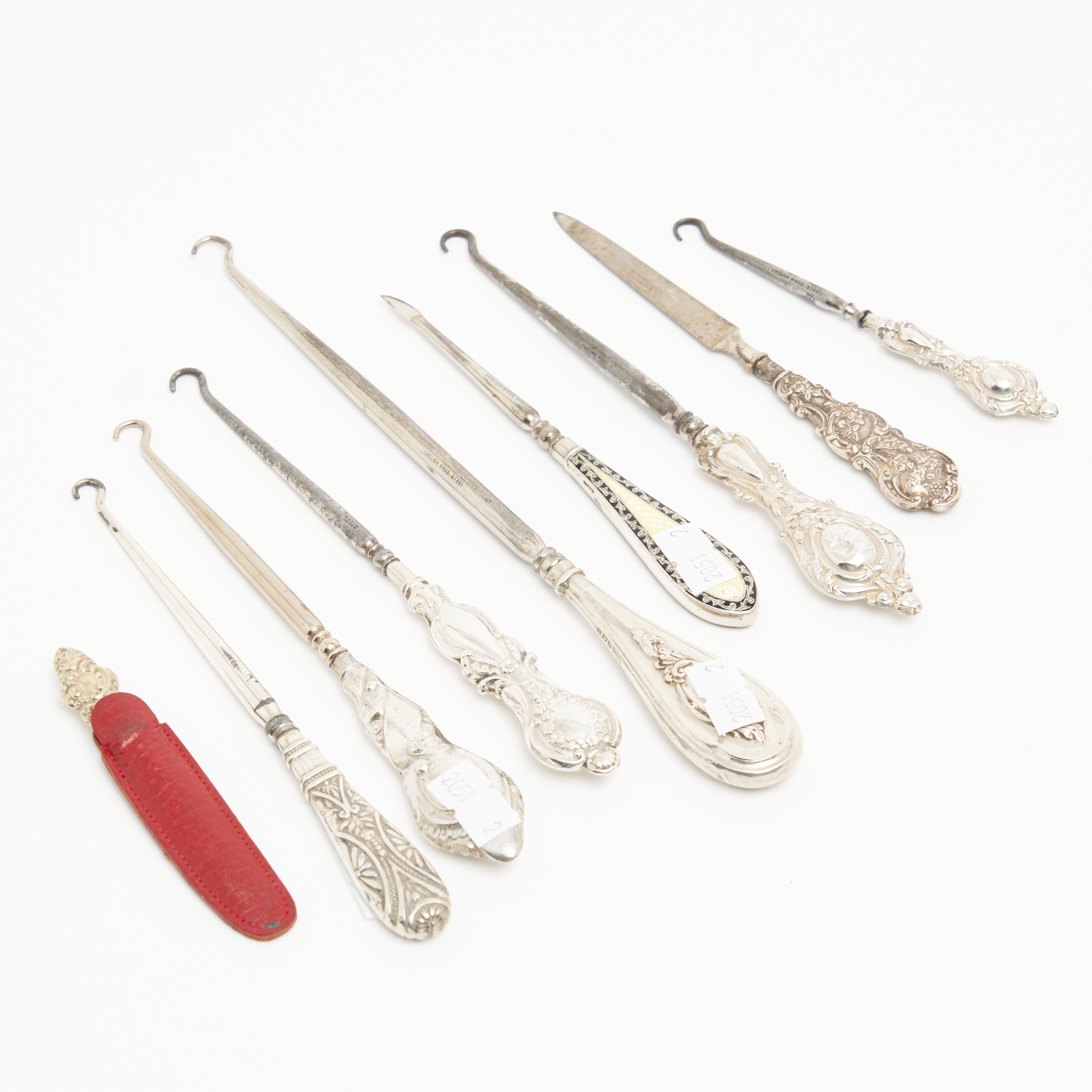 A COLLECTION OF NINE ENGLISH STERLING SILVER HANDLED BUTTON HOOKS AND FILES L.23CM