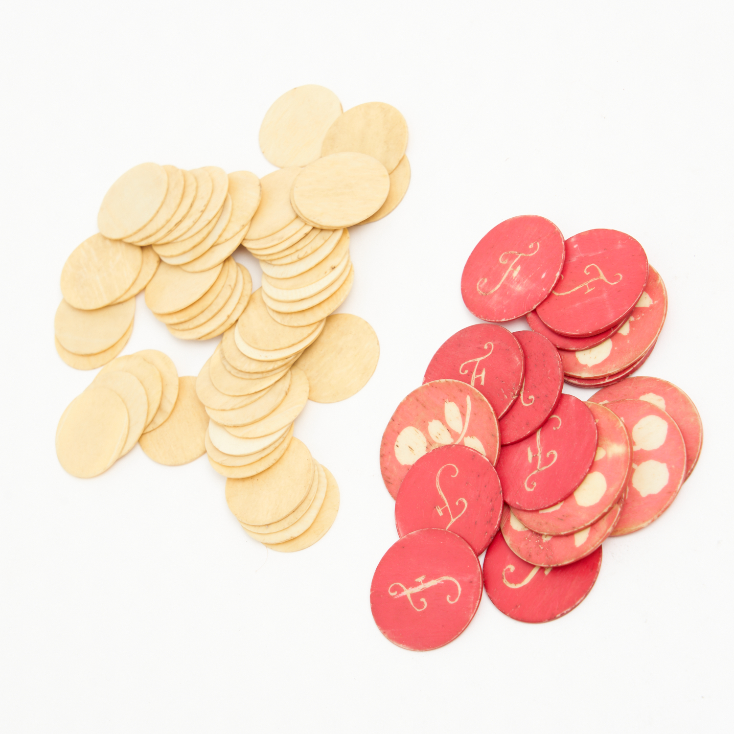A COLLECTION OF EARLY 18TH CENTURY WHALEBONE GAME COUNTERS, SOME WITH STENCIL LETTER AND FLORAL DESIGNS