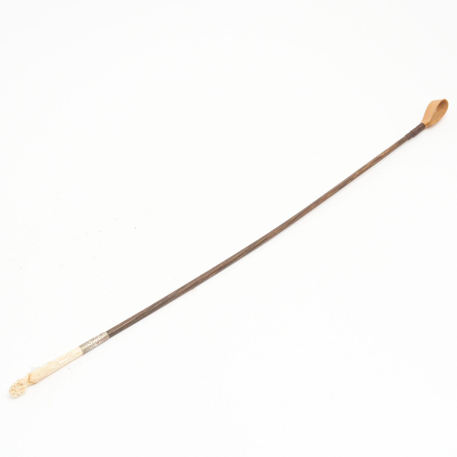 AN EARLY 19TH CENTURY CARVED WHALE BONE HANDLED STERLING SILVER MOUNTED RIDING CROP L.64CM