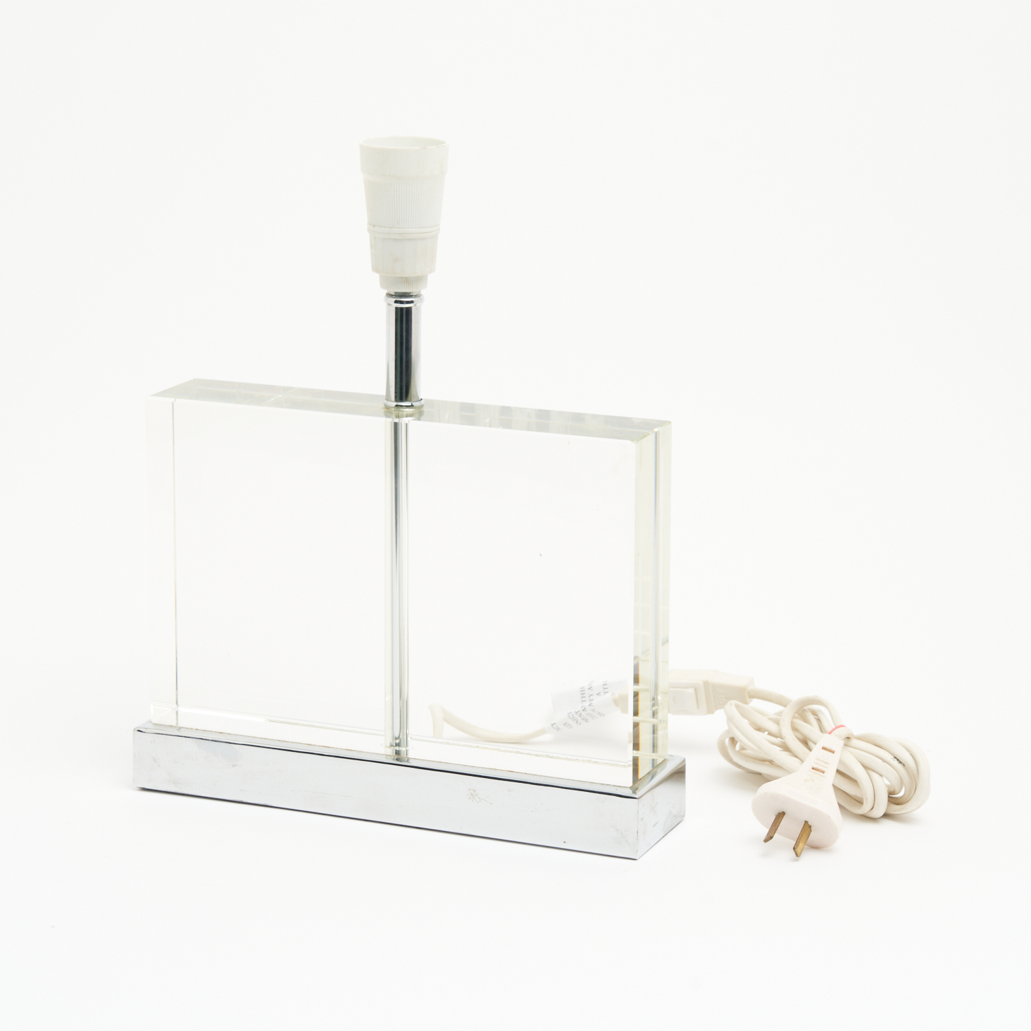 A CONTEMPORARY GLASS BLOCKED CHROME BASED TABLE LAMP H.31CM