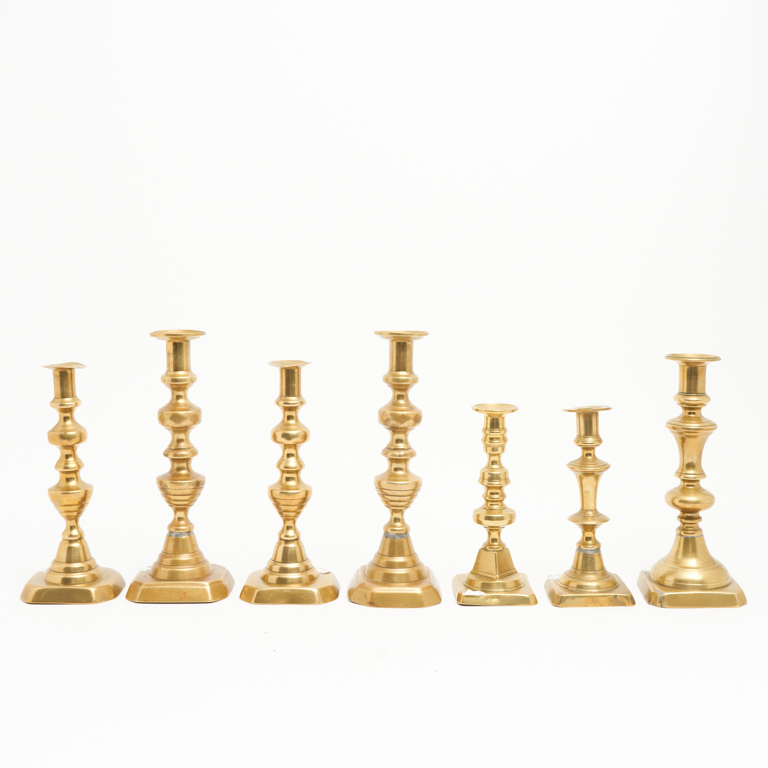 A COLLECTION OF 7 VICTORIAN BRASS CANDLESTICKS H.27.5CM (TALLEST)