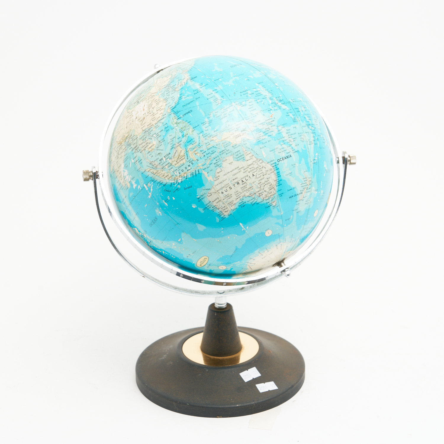 A MID-CENTURY METAL BASED WORLD GLOBE H.35CM