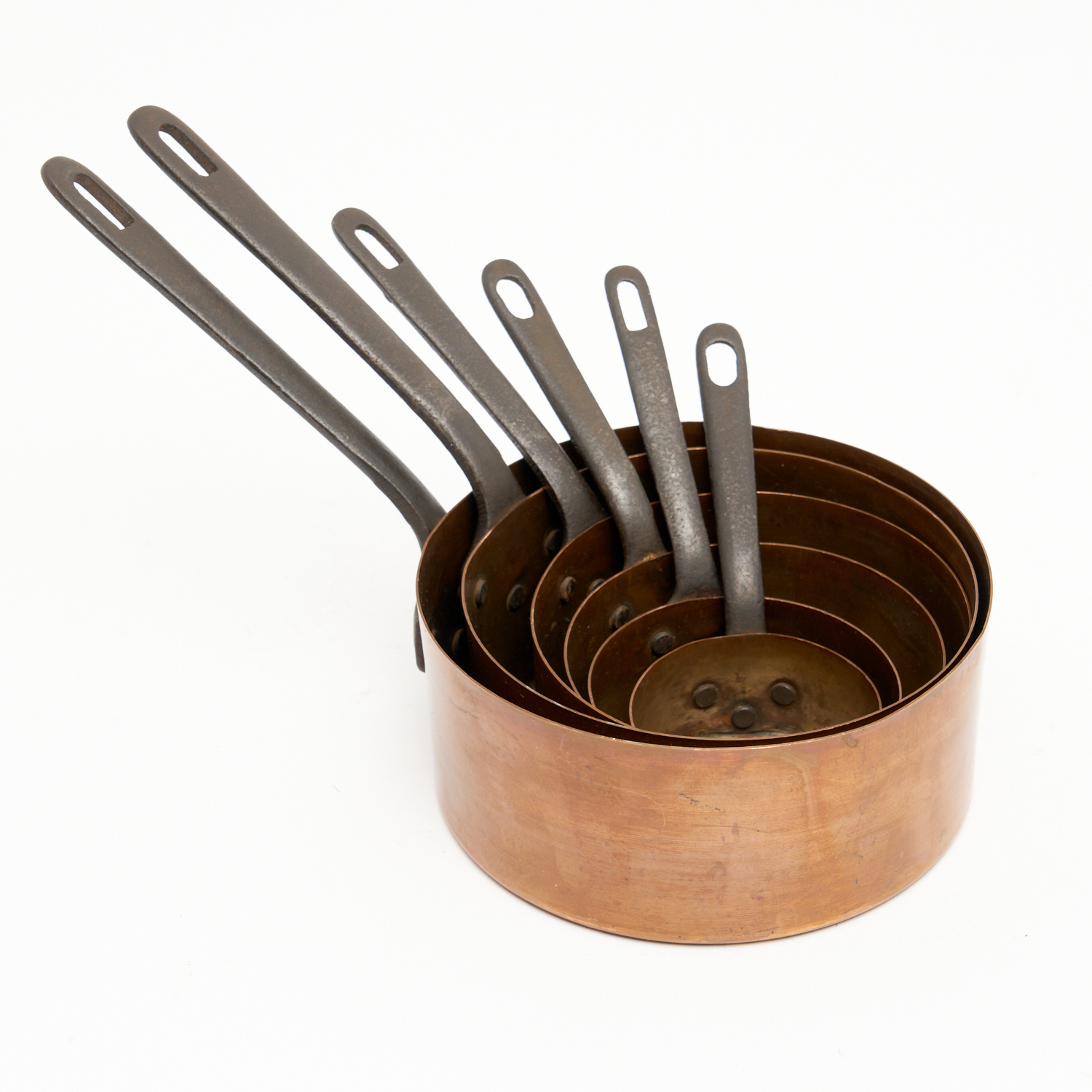 A GRADUATED SET OF 6 FRENCH COPPER AND WROUGHT IRON HANDLED SAUCEPANS DIA.18CM