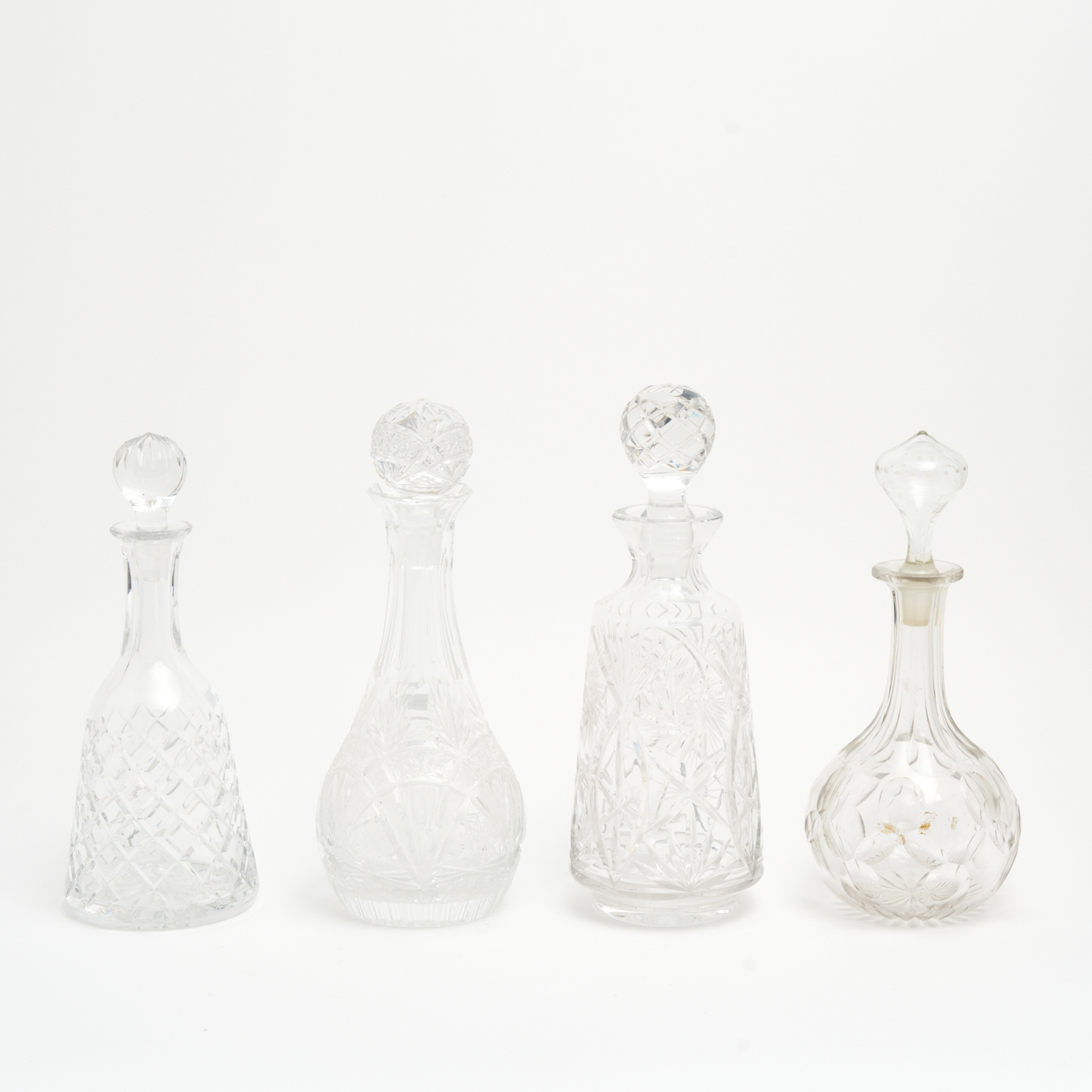 A COLLECTION OF FOUR HAND CUT CRYSTAL DECANTERS WITH ORIGINAL STOPPERS (A/F) H.31CM (TALLEST)