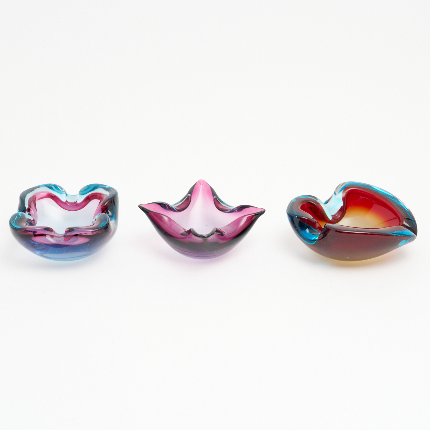 THREE ART GLASS ITALIAN BOWLS IN BLUE AND PURPLE L.16CM