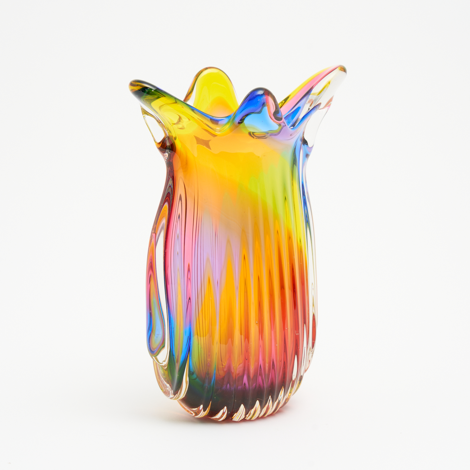 A RAINBOW COLOURED FLUTED ART GLASS VASE H.25CM